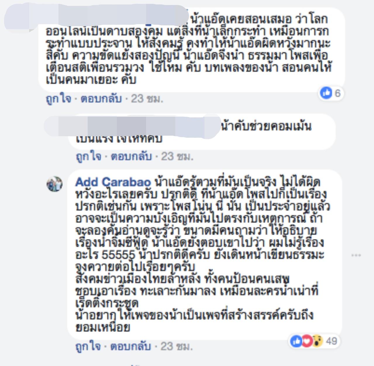 ซึ่ง แอ๊ด คาราบาว ก็ตอบว่า "น้าแอ๊ดรู้ตามที่มันเป็นจริง ไม่ได้ผิดหวังอะไรเลยครับ ปกติดี ที่น้าแอ๊ดโพสต์ไปก็เป็นเรื่องปกติเช่นกัน เพราะโพสต์โน่น นี่ นั่น เป็นประจำอยู่แล้ว อาจจะเป็นความบังเอิญที่มันไปตรงกับเหตุการณ์ ถ้าจะลองค้นอ่านดูจะรู้ว่า ขนาดมีคนถามว่าให้อธิบายเรื่องน้ำจิ้มซีฟู้ด น้าแอ๊ดยังตอบเขาไปว่า ผมไม่รู้เรื่องอะไร 55555 น้าปกติดีครับ ยังเดินหน้าเขียนธรรมะจูงควายต่อไปเรื่อยๆครับ