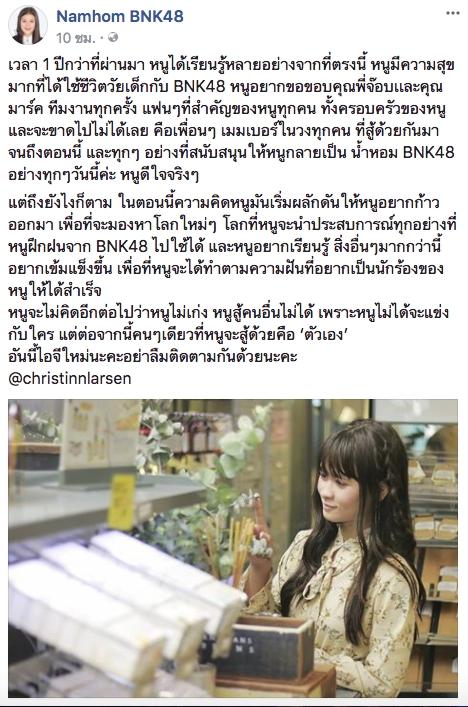 โดย น้ำหอม ได้โพสต์รูปตัวเองและข้อความในแฟนเพจ Namhom BNK48 ไว้ว่า “เวลา 1 ปีกว่าที่ผ่านมา หนูได้เรียนรู้หลายอย่างจากที่ตรงนี้ หนูมีความสุขมากที่ได้ใช้ชีวิตวัยเด็กกับ BNK48 หนูอยากขอขอบคุณพี่จ๊อบเเละคุณมาร์ค ทีมงานทุกครั้ง แฟนๆ ที่สำคัญของหนูทุกคน ทั้งครอบครัวของหนูและจะขาดไปไม่ได้เลย คือเพื่อนๆ เมมเบอร์ในวงทุกคน ที่สู้ด้วยกันมาจนถึงตอนนี้ และทุกๆ อย่างที่สนับสนุนให้หนูกลายเป็น น้ำหอม BNK48 อย่างทุกๆ วันนี้ค่ะ หนูดีใจจริงๆ
