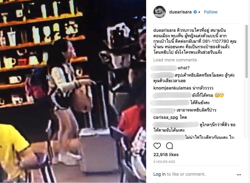 เกือบจะต้องเสียของไปซะแล้วสำหรับนางร้ายสาวร่างเล็กเซ็กซี่ ดิว อริสรา ทองบริสุทธิ์ โดยเจ้าตัวเดินทางไปที่สนามบินดอนเมืองเพื่อจะไปทำงานที่ จ.เชียงใหม่ แต่อยู่ๆ ก็งานเข้าเมื่อมีหญิงสาวคนหนึ่งลากกระเป๋าเดินทางไป ทำเอาเจ้าตัวร้อนใจ รีบไปดูภาพวงจรปิดของร้านกาแฟร้านหนึ่ง จากนั้นดิวได้โพสต์ภาพผู้หญิงคนดังกล่าวกับกระเป๋าเดินทางและเขียนข้อความว่า “ดิวรบกวนใครที่อยู่ สนามบินดอนเมือง พบเห็น ผู้หญิงแต่งตัวแบบนี้ ลากกระเป๋าใบนี้ ติดต่อกลับมาที่ 081-1107780 คุณนํ้ามน หน่อยนะคะ คือเป็นกระเป๋าของดิวแล้วโดนหยิบไป ยังไงใครพบเห็นช่วยรีบแจ้ง”