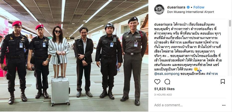 ดิวไม่ไปทำงานที่เชียงใหม่สาย ได้ของคืนครบ ขอบคุณมากๆ จริงๆ ค่ะ .. ขอบคุณสายการบินไทยแอร์เอเชีย ที่เข้าใจและช่วยเหลือทำให้ดิวไม่คลาด ไฟลต์ ด้วยเช่นกันนะคะ และขอบคุณทุกคนที่ช่วยโพสต์ แชร์ และเป็นหูเป็นตาให้ดิวนะคะ @eak.sompong ขอบคุณอีกครั้งค่ะ #ตำรวจไทยเก่งนะ”.