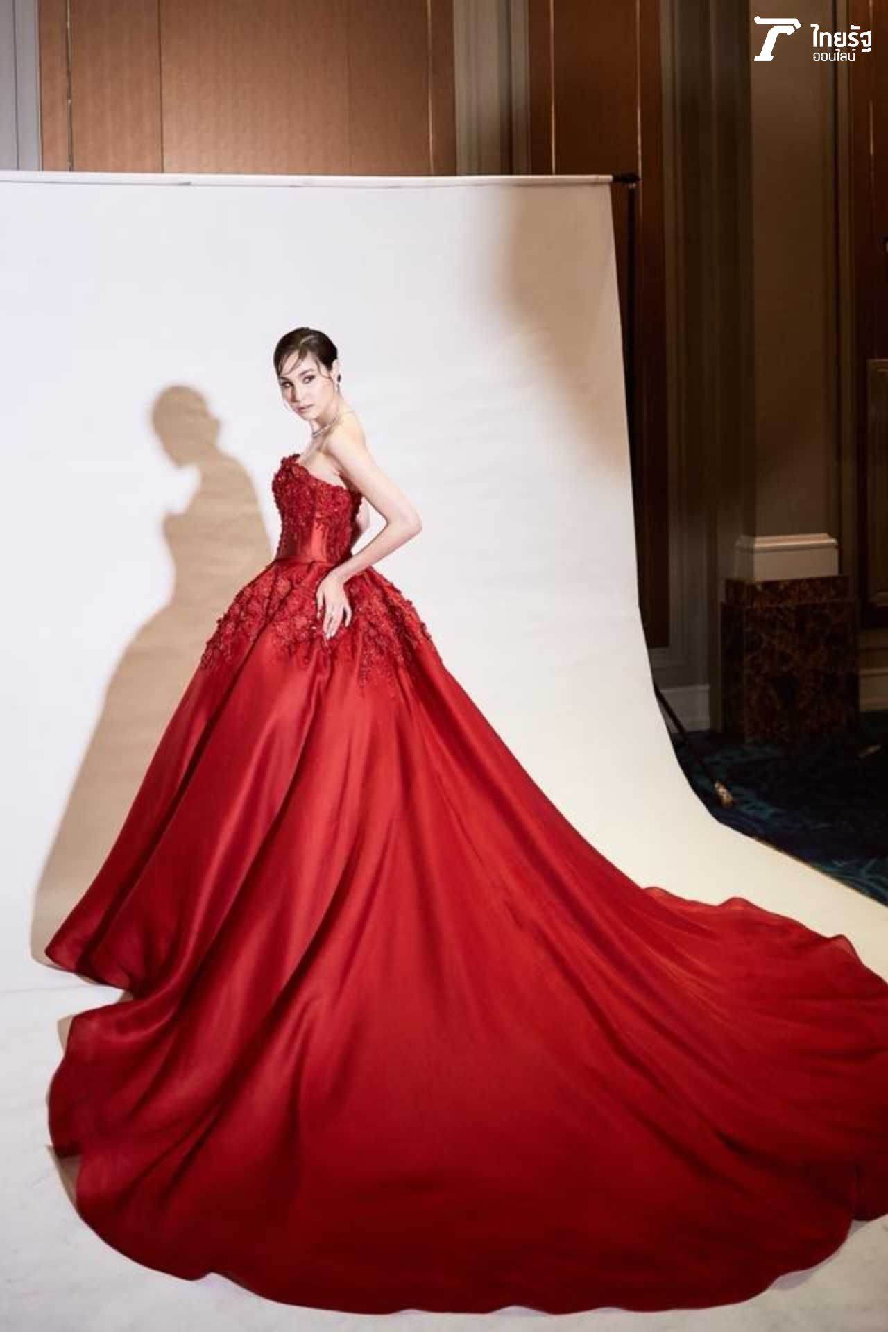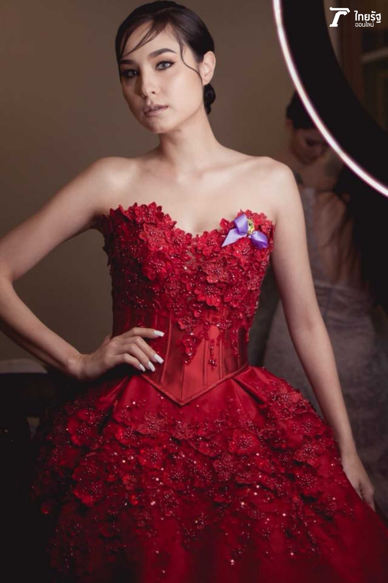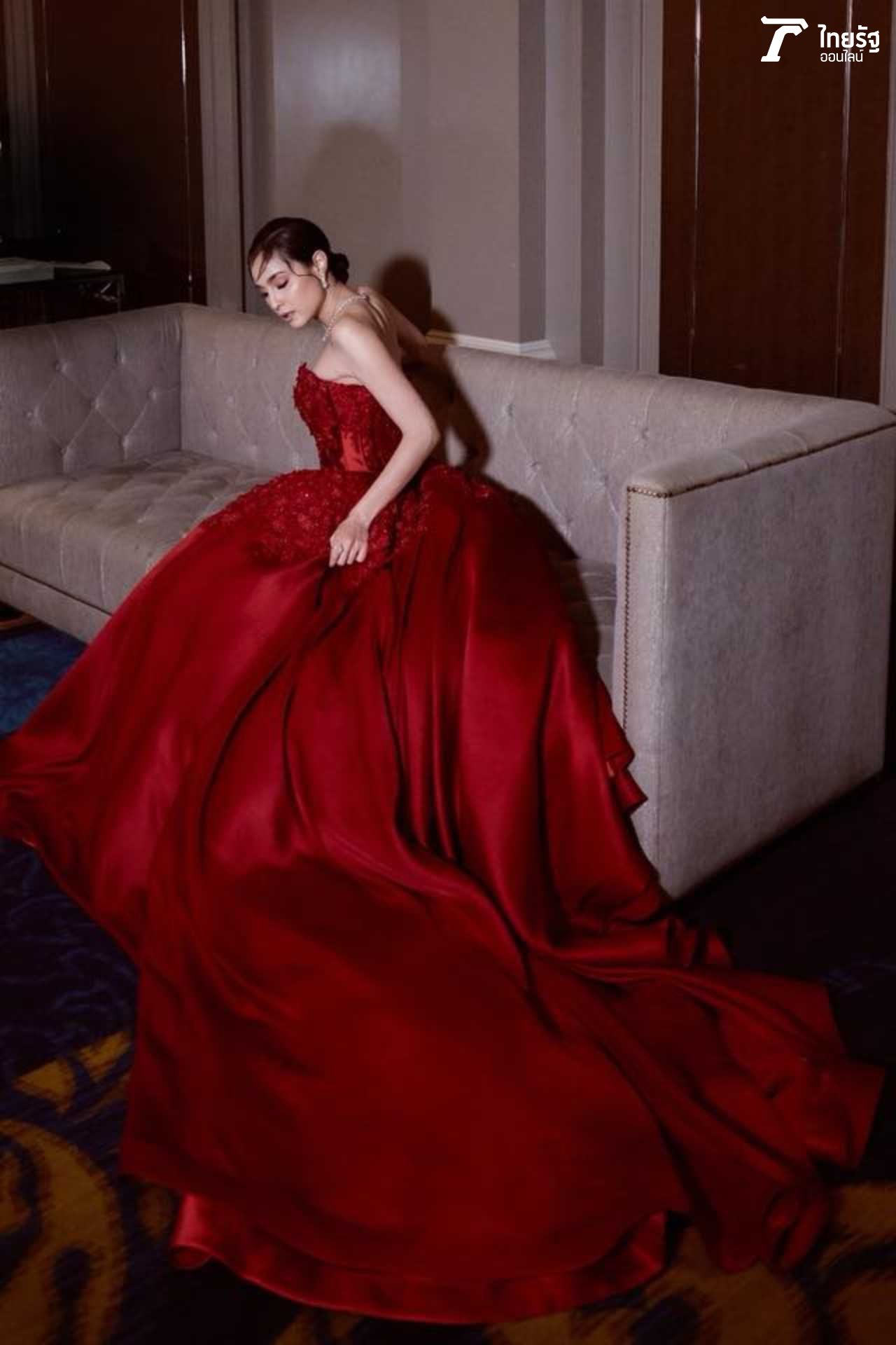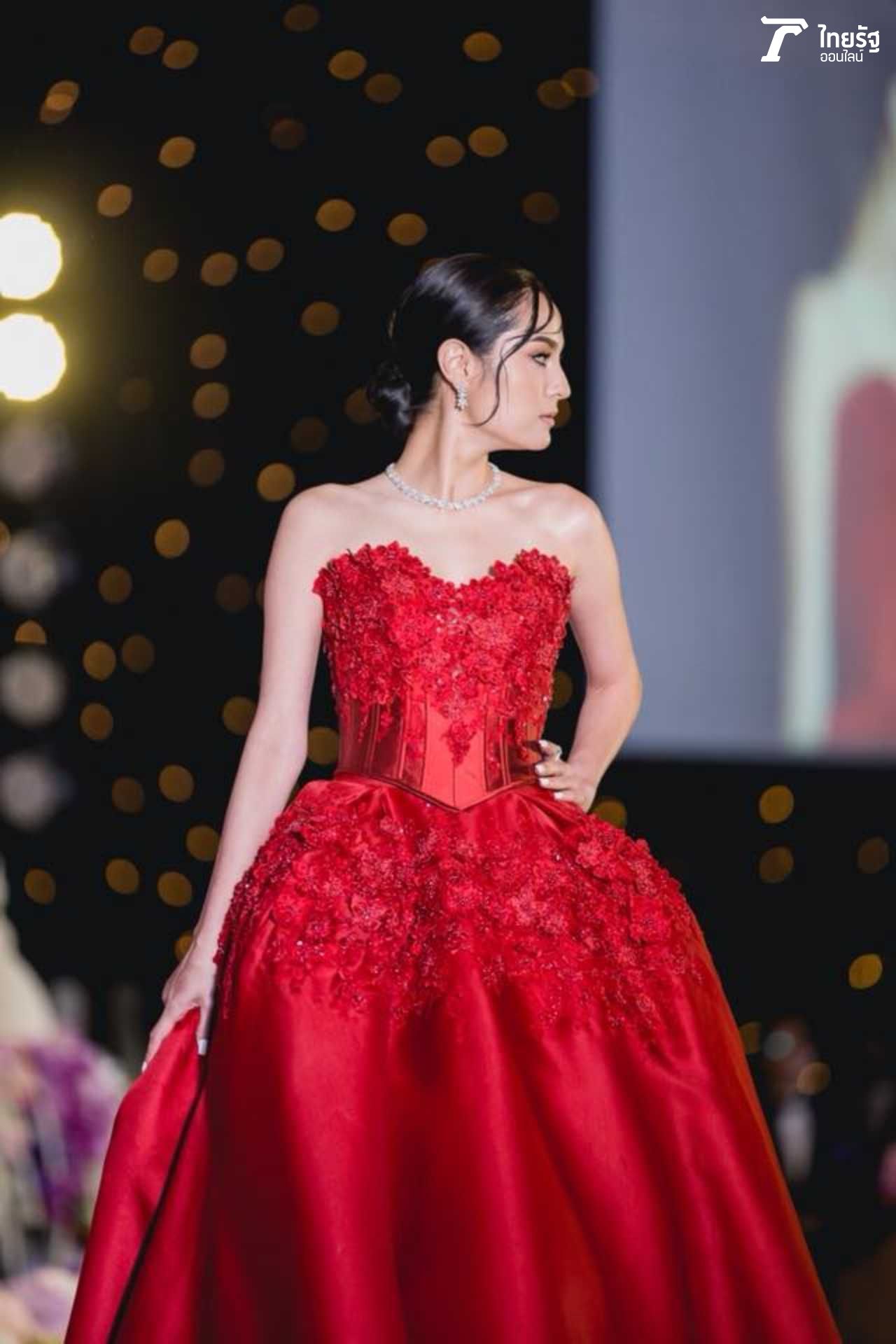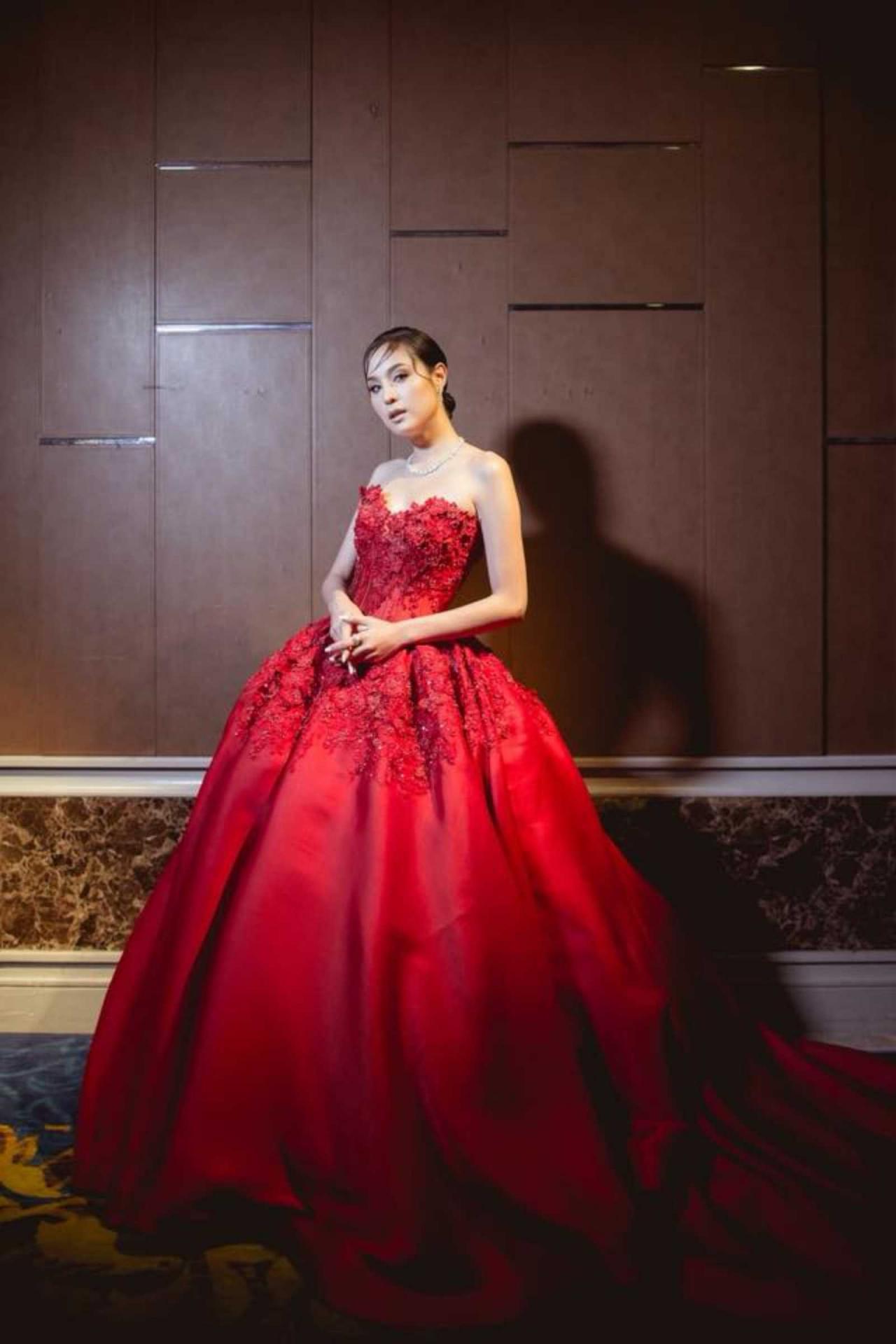 ขวัญแดงเด่นมาแต่ไกล ในชุดสุดประณีตบรรจงของแบรนด์ดัง ฟินาเล่เวดดิ้งสตูดิโอ FINALE WEDDING STUDIO ซึ่งออกแบบโดยสองดีไซเนอร์แถวหน้าของไทย ปลา สุดจิตร์ สุดจิตต์, เก เกสินี กล่ำอยู่สุข ออร่าแรงชัดมากๆ เรียกว่าขวัญเป็นนางเอกเรตติ้งทะลุจอ เป็นนางแบบก็เก่งกาจ มีลีลาที่เตะตาไม่เหมือนใคร.