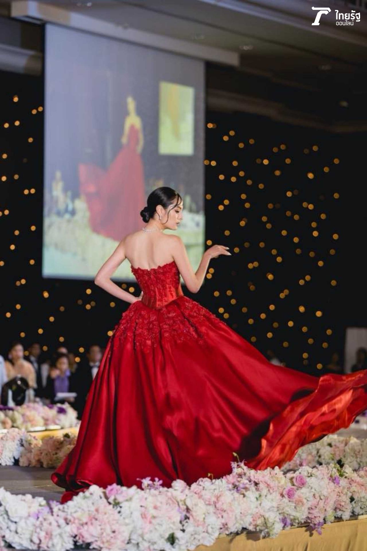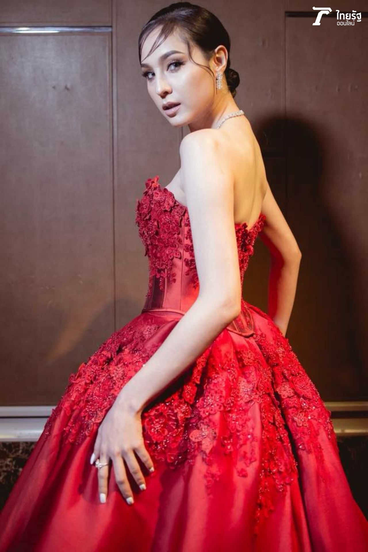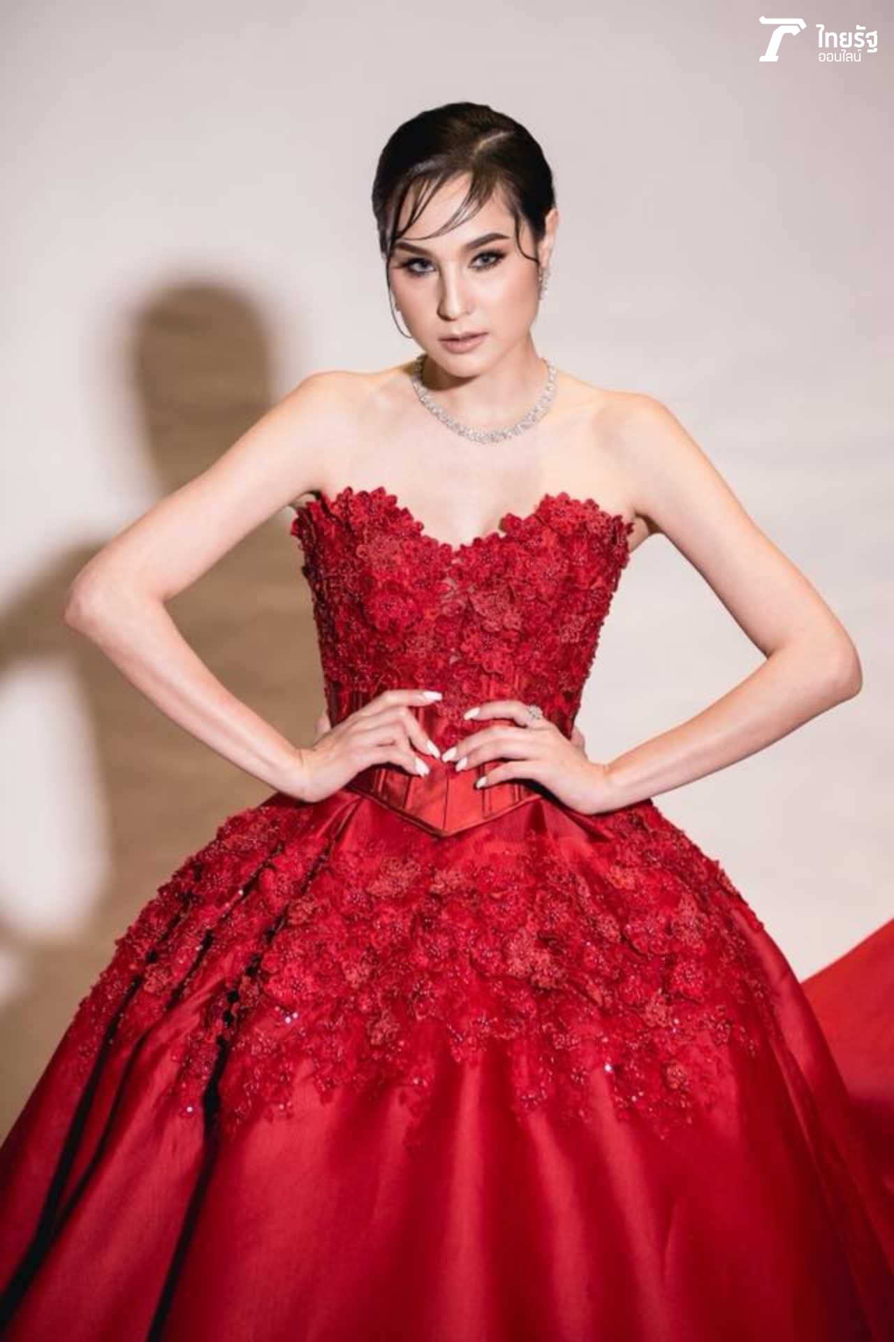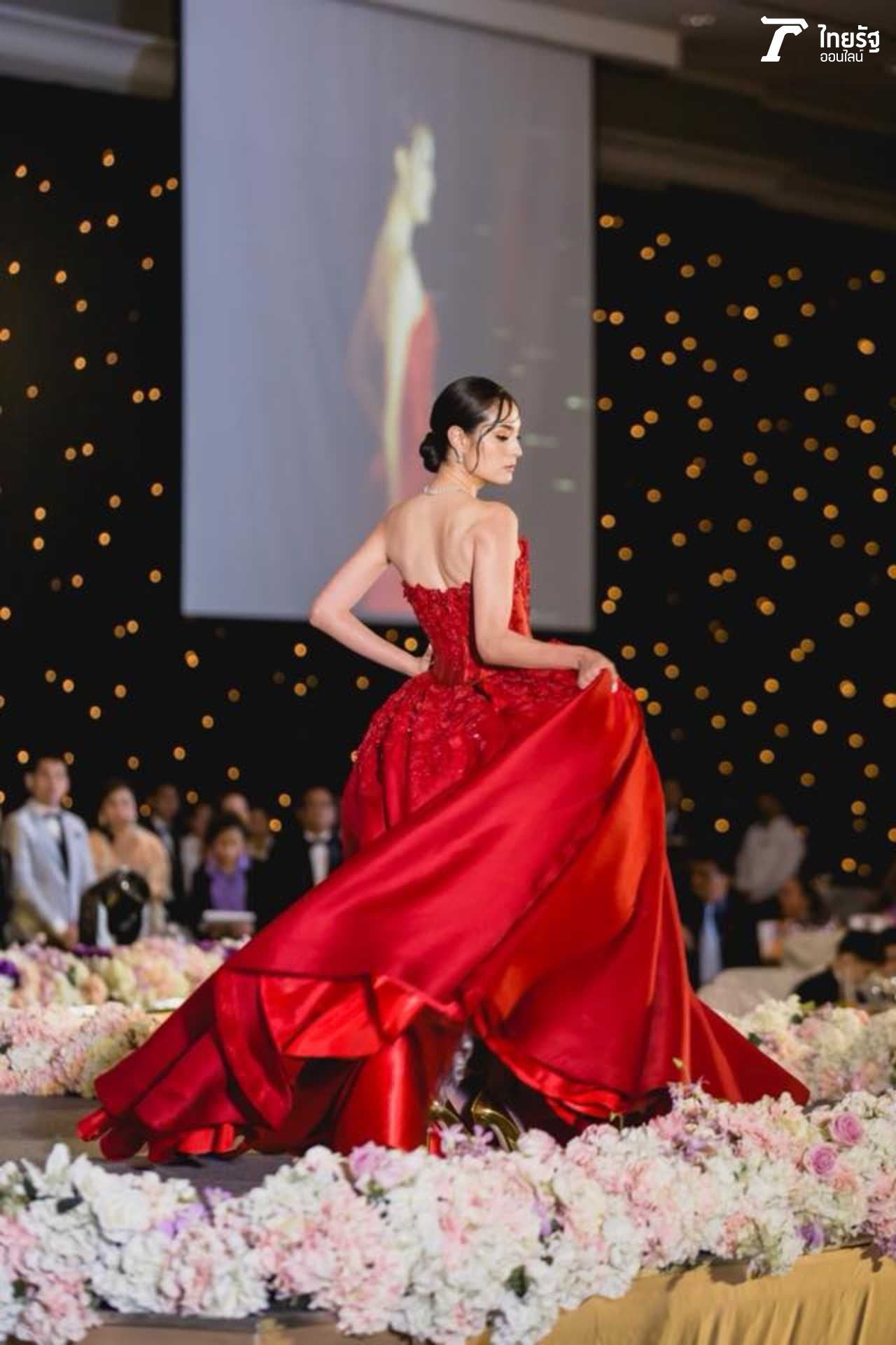 ขวัญแดงเด่นมาแต่ไกล ในชุดสุดประณีตบรรจงของแบรนด์ดัง ฟินาเล่เวดดิ้งสตูดิโอ FINALE WEDDING STUDIO ซึ่งออกแบบโดยสองดีไซเนอร์แถวหน้าของไทย ปลา สุดจิตร์ สุดจิตต์, เก เกสินี กล่ำอยู่สุข ออร่าแรงชัดมากๆ เรียกว่าขวัญเป็นนางเอกเรตติ้งทะลุจอ เป็นนางแบบก็เก่งกาจ มีลีลาที่เตะตาไม่เหมือนใคร.