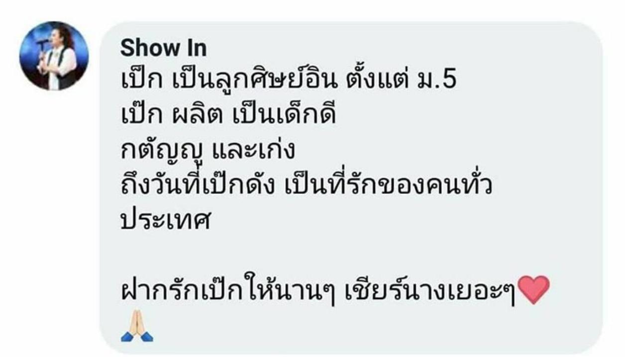 “เป๊ก เป็นลูกศิษย์อิน ตั้งแต่ ม.5 เป๊ก ผลิต เป็นเด็กดี กตัญญู และเก่ง ถึงวันที่เป๊กดัง เป็นที่รักของคนทั่วประเทศ ฝากรักเป๊กให้นานๆ เชียร์นางเยอะๆ” และ “ผลิต ลูกศิษย์อินนะคะ ฝากนางด้วย นางเป็นคนดี กตัญญูและเก่งมาก ถึงวันของเป๊กซักที”