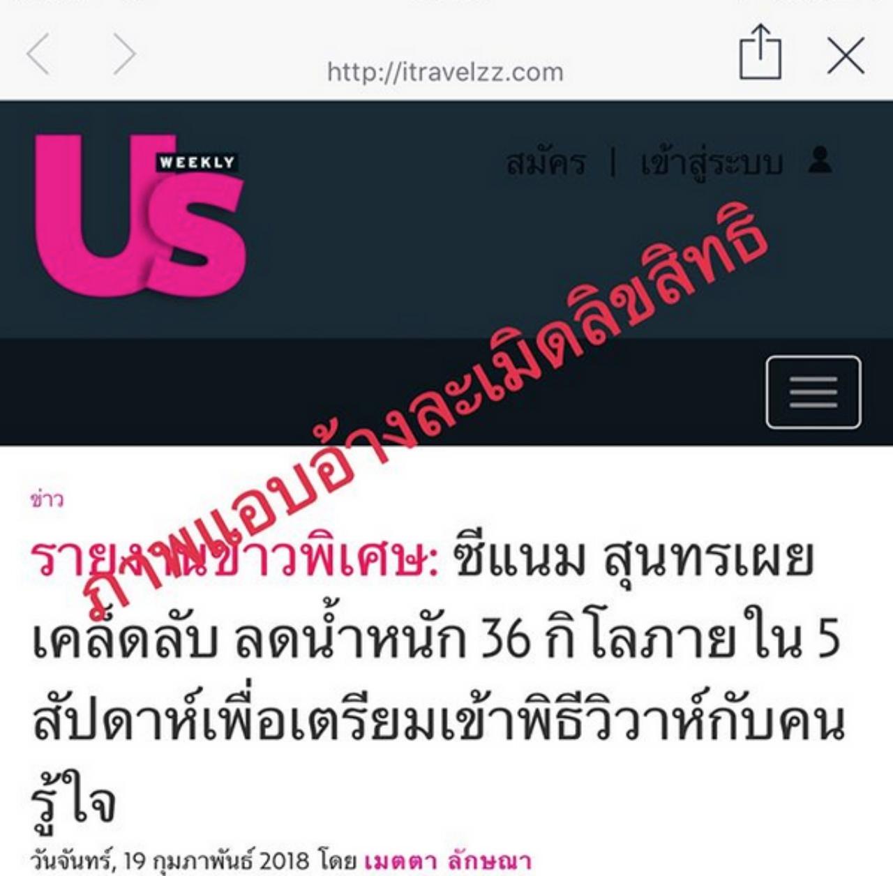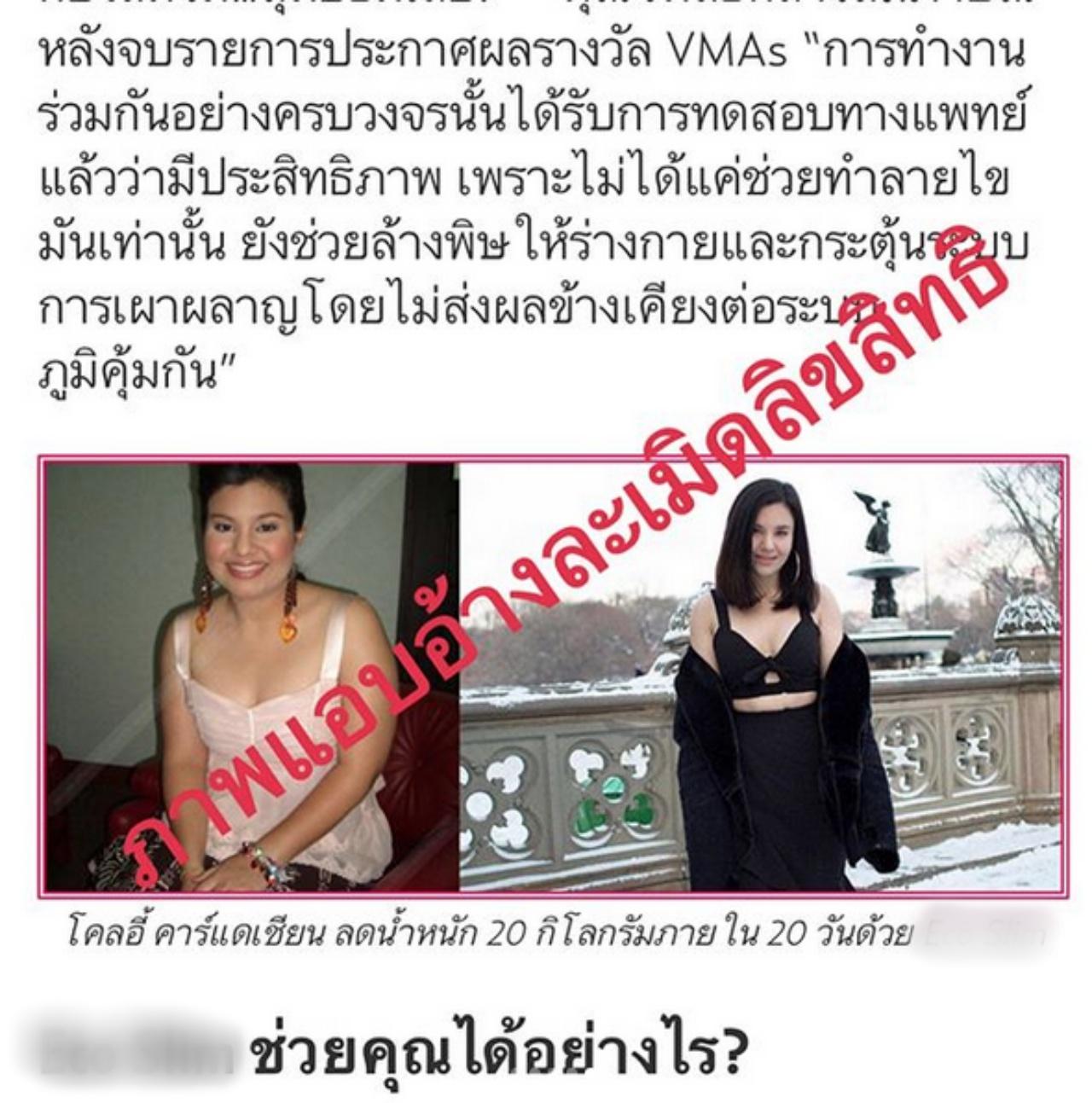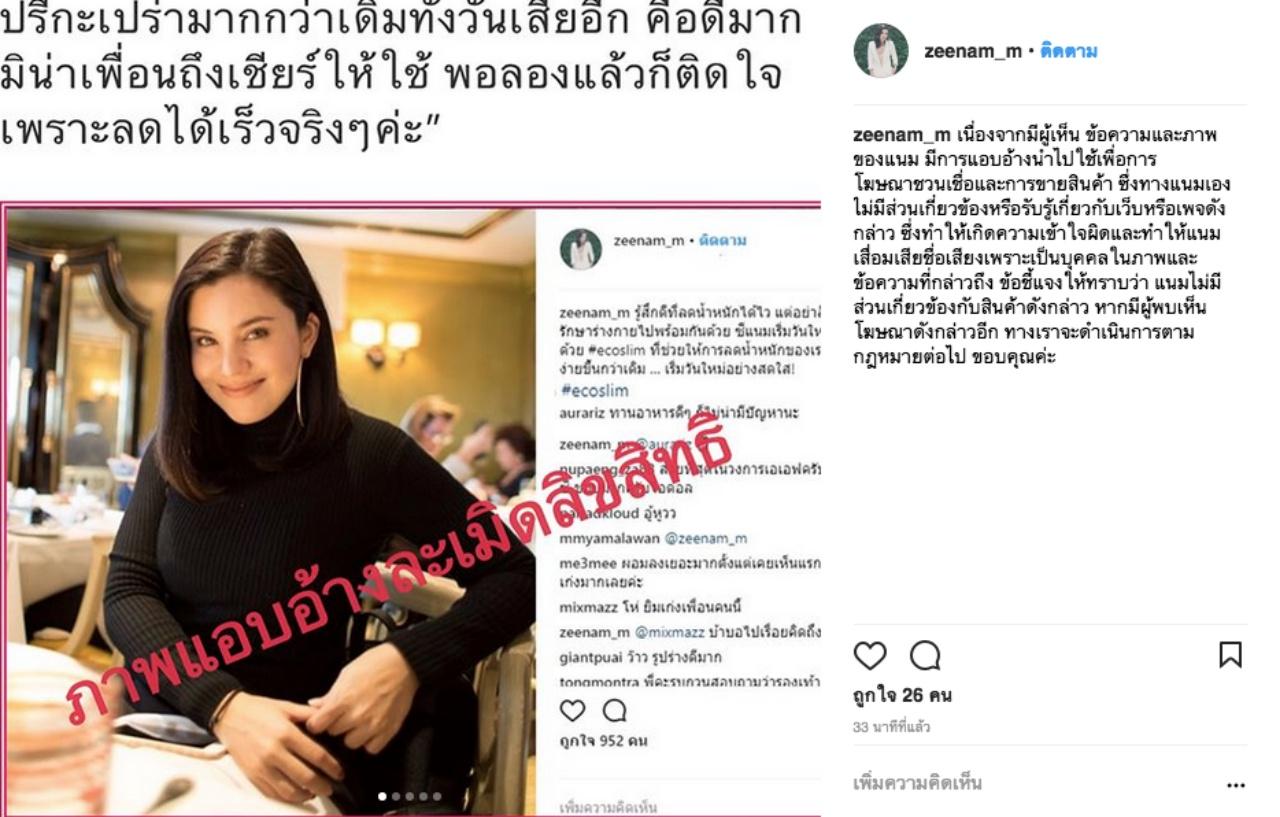 “เนื่องจากมีผู้เห็นข้อความและภาพของแนม มีการแอบอ้างนำไปใช้เพื่อการโฆษณาชวนเชื่อและการขายสินค้า ซึ่งทางแนมเองไม่มีส่วนเกี่ยวข้องหรือรับรู้เกี่ยวกับเว็บหรือเพจดังกล่าว ซึ่งทำให้เกิดความเข้าใจผิด และทำให้แนมเสื่อมเสียชื่อเสียง เพราะเป็นบุคคลในภาพและข้อความที่กล่าวถึง ข้อชี้แจงให้ทราบว่า แนมไม่มีส่วนเกี่ยวข้องกับสินค้าดังกล่าว หากมีผู้พบเห็นโฆษณาดังกล่าวอีก ทางเราจะดำเนินการตามกฎหมายต่อไป ขอบคุณค่ะ”