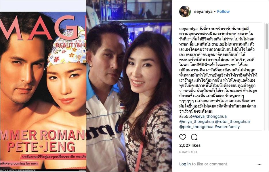 มาวันนี้มองย้อนกลับไปคำดูถูกทั้งหลายมันทำให้เราเข้มแข็ง ทำให้เราฮึดสู้ ทำให้เรารักและเข้าใจกันมากขึ้น ทำให้เจ็งดูแลตัวเอง ทุกวันนี้คงสภาพนี้ได้ส่วนนึงต้องขอบคุณคำดูถูกจากคนอื่น มันเป็นพลังให้เราไม่ยอมแพ้ ซักวันลูกก้อจะแข็งแรงขึ้นแบบมี๊นะคะ รักหนูมากๆๆๆๆๆๆๆ (แปลกมากๆทำไมเราสองคนยิ่งแก่ตามันโตขึ้นเองยังไม่เคยลงมีดที่หน้ากันเลยแต่คาดว่าเร็วๆนี้คงจะต้องซะล่ะ555)@seya_thongchua @miya_thongchua @rotor_thongchua @pete_thongchua#wearefamily #loveyou” โดยหลัง สาวเจ็ง โพสต์ก็มีแฟนๆ เข้ามาให้กำลังใจเจ้าตัวเป็นจำนวนมาก.