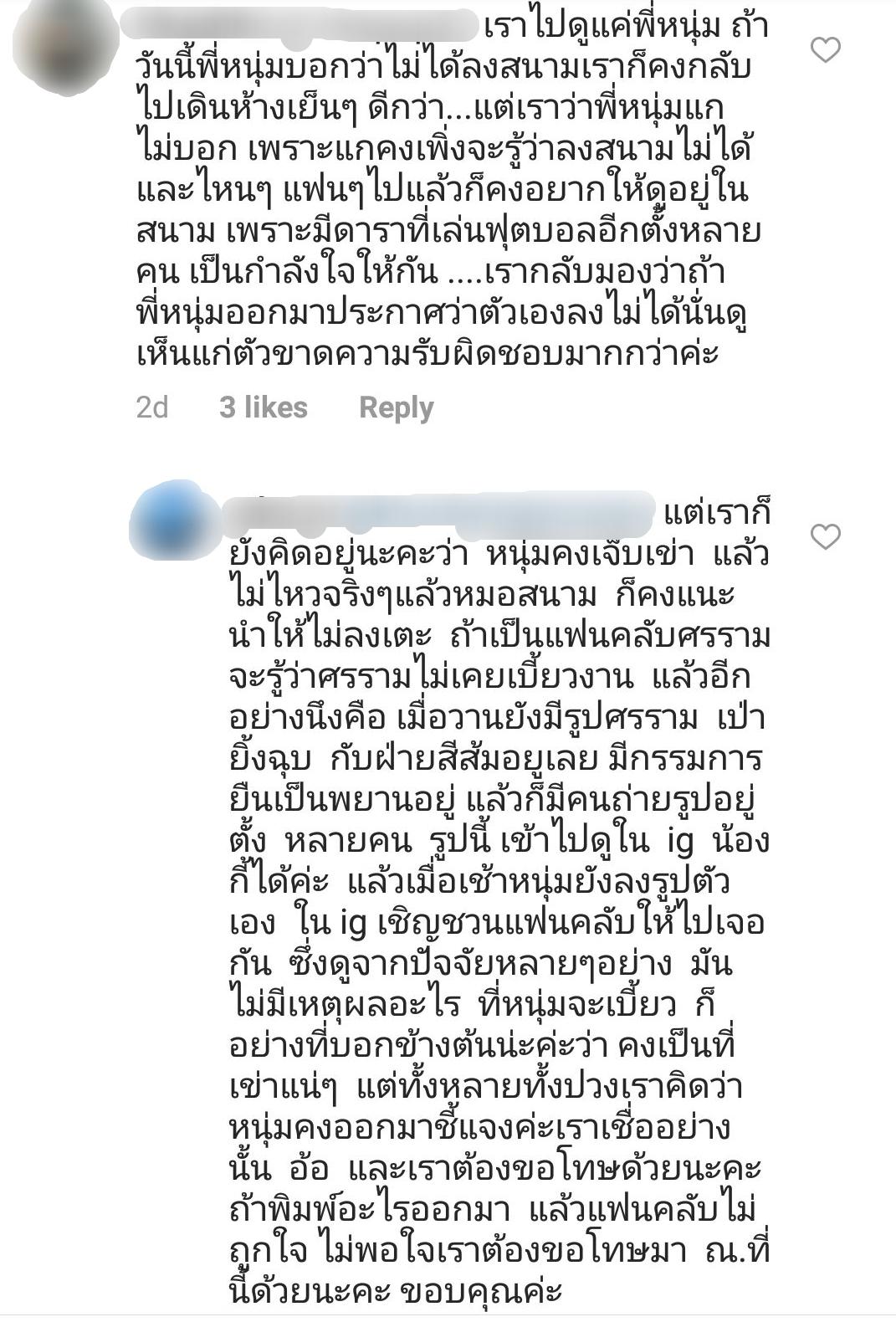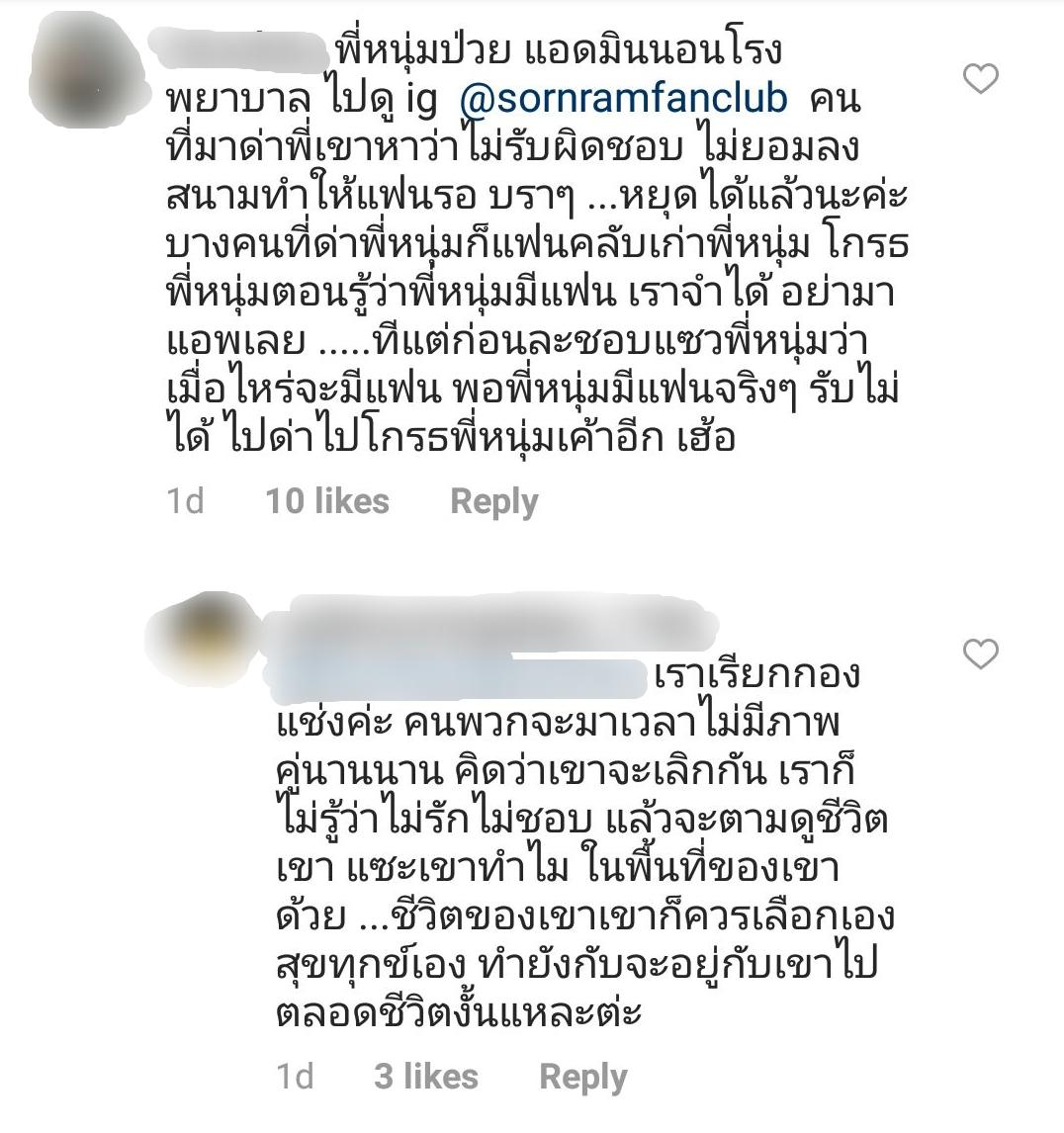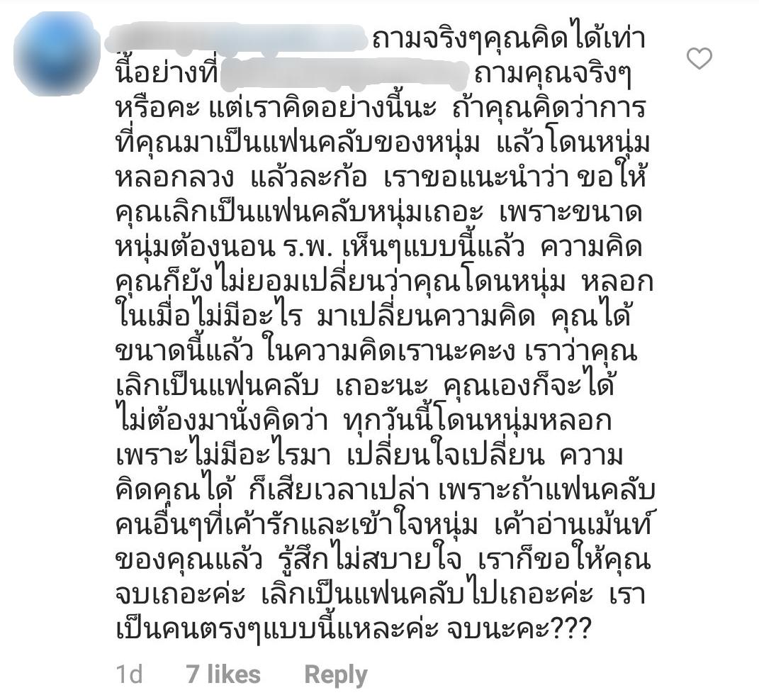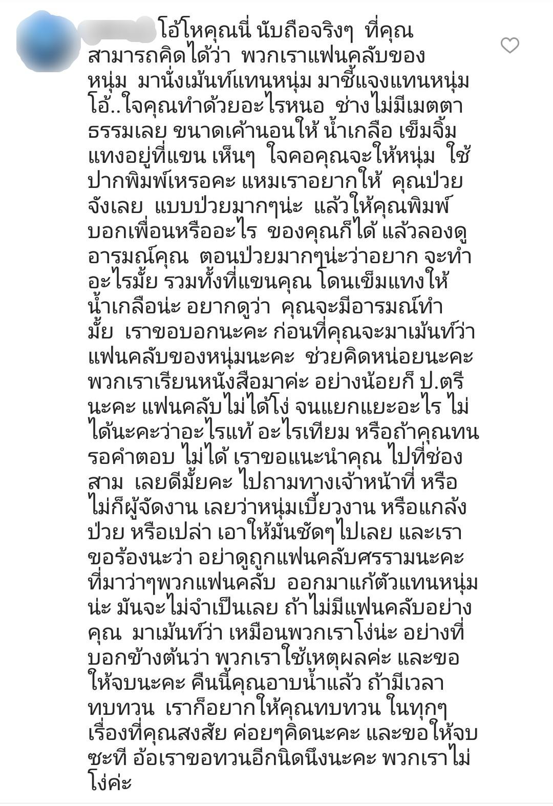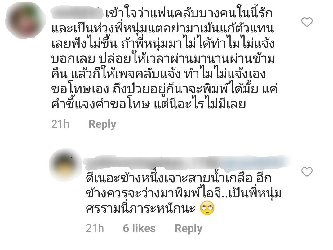 แต่เรื่องกลับไม่จบแค่นั้น เมื่อมีชาวโซเชียลฯ บางคนไม่พอใจ เข้าไปโพสต์ไอจีต่อว่าในไอจีของหนุ่มทำนองว่าไม่มีความรับผิดชอบ ทำตัวไม่เหมือนเดิม แฟนคลับอย่าแก้ตัวให้เลยเพราะฟังไม่ขึ้น ทำไมหนุ่มถึงไม่ออกมาชี้แจงด้วยตัวเอง ปล่อยเวลาผ่านมานานข้ามคืน และให้เพจคลับชี้แจงแทน ถึงป่วยก็น่าจะพิมพ์ได้