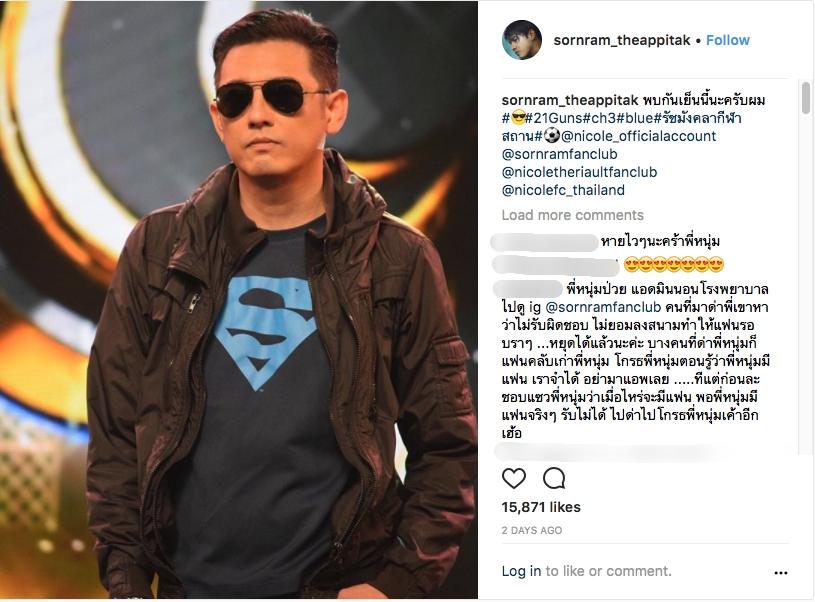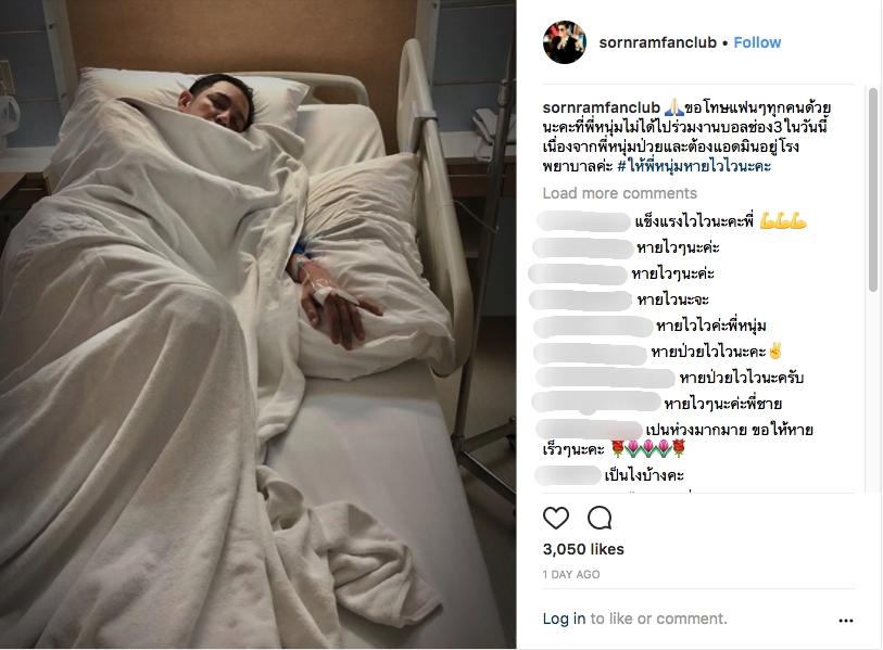 แต่สุดท้ายไอจีแฟนคลับโพสต์ภาพหนุ่มกำลังนอนพักรักษาตัวใน รพ. พร้อมด้วยข้อความว่า “ขอโทษแฟนๆ ทุกคนด้วยนะคะที่พี่หนุ่มไม่ได้ไปร่วมงานบอลช่อง 3 ในวันนี้ เนื่องจากพี่หนุ่มป่วยและต้องแอดมิทอยู่โรงพยาบาลค่ะ #ให้พี่หนุ่มหายไวไวนะคะ”