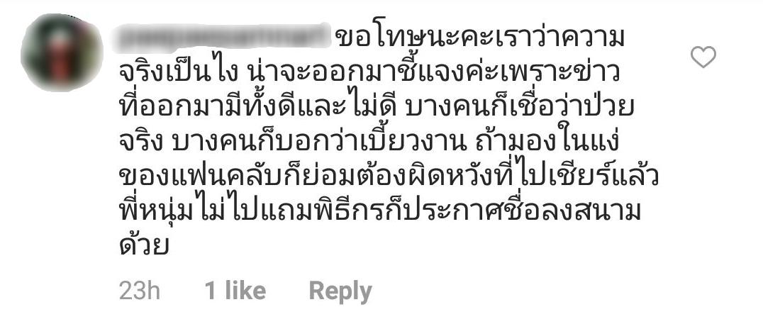 นอกจากนี้ยังมีบางคนแสดงความคิดเห็นว่าเจ้าตัวควรชี้แจงเองเพราะมีข่าวออกมาทั้งดีและไม่ดี บางคนเชื่อว่าป่วย แต่บางคนมองว่าเบี้ยวงาน แต่ก็มีแฟนคลับเข้ามาชี้แจงว่าอีกฝ่ายไม่สบายจริงๆ จะให้มาตอบก็เป็นภาระหนักไปหรือเปล่า จนกลายเป็นการโต้เถียงกันไปมาด้วย.