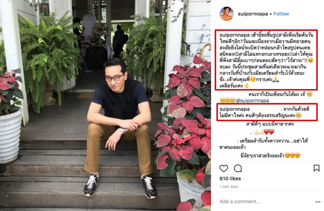 "เช้านี้ขอขึ้นรูปสามีเพื่อเริ่มต้นวันใหม่ดีๆ อีก 1 วัน และเนื่องจากเมื่อวานมีหลายคนสงสัยยิงไลน์ระเบิดว่า หล่อนกล้าโพสต์รูปคนเคยสนิทลง IG สามีไม่แหกอกเอาเหรอยะ!! เล่าให้คุณพี่ฟังสามียิ้มเบาๆ ก่อนตอบชัดๆ ว่า "ไร้สาระ"!! จบมะ วันนี้ประชุมสามที่ แต่เดี๋ยวจะแวะมากินกลางวันที่บ้านกับเมีย เตรียมสำรับไว้ด้วยนะจ๊ะ..เจ้าค่ะคุณพี่ กราบค่ะ เคลียร์นะคะ".