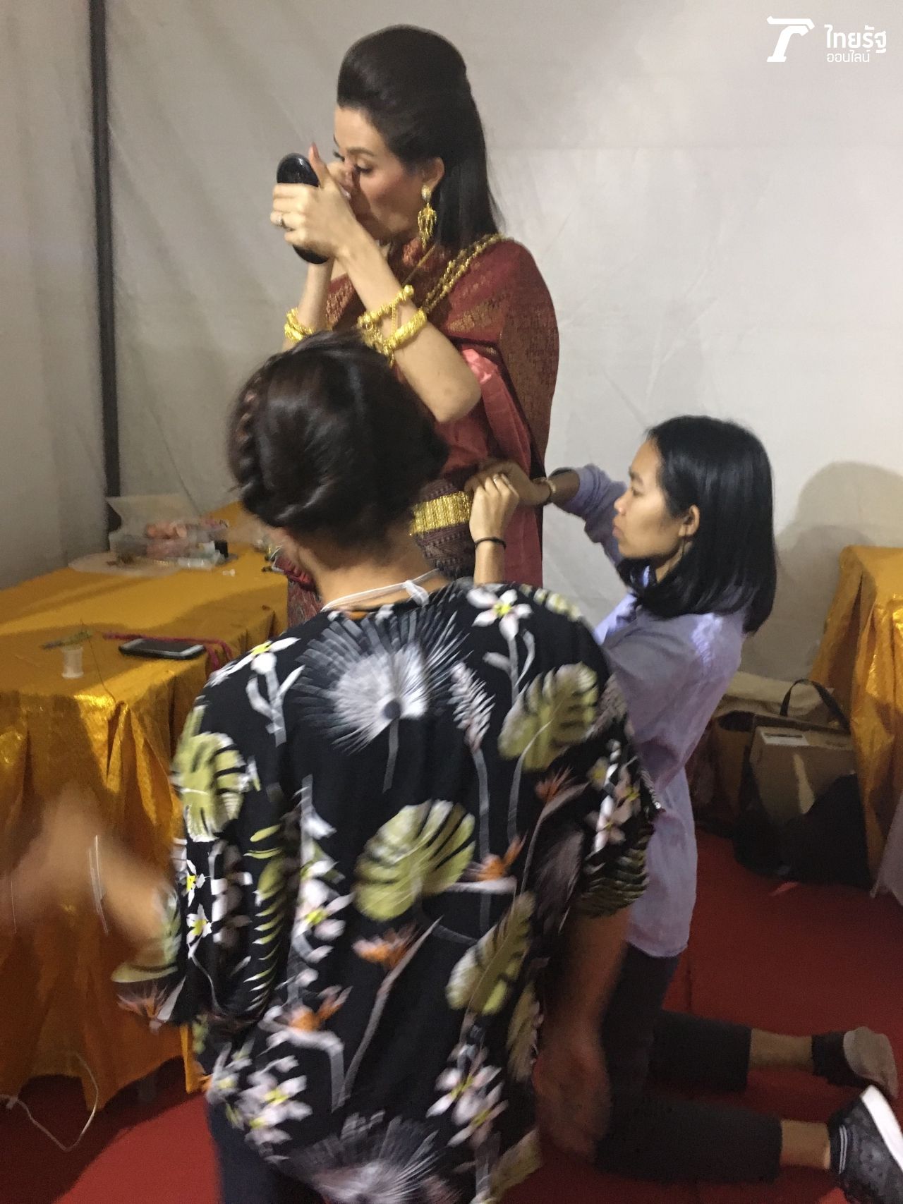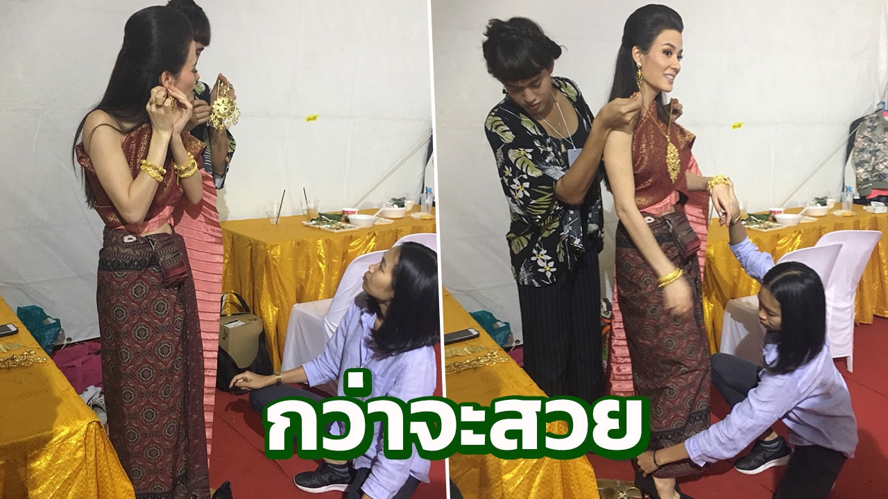 กว่าจะสวยงามในชุดไทย ก็ต้องใช้เวลาแต่งหน้าทำผม แต่งชุดค่อนข้างนานทีเดียว เวลาเร่งรีบต้องมีคนช่วยๆ แต่งกันหลายคนให้เสร็จทันเวลาโชว์ งานอาจจะดูวุ่นวายไปหน่อย เพราะดารามากันเยอะมาก แต่ซูซี่ ก็ไม่หงุดหงิด ไม่เหวี่ยงไม่วีน ยังขยันแจกยิ้มเรื่อยๆ