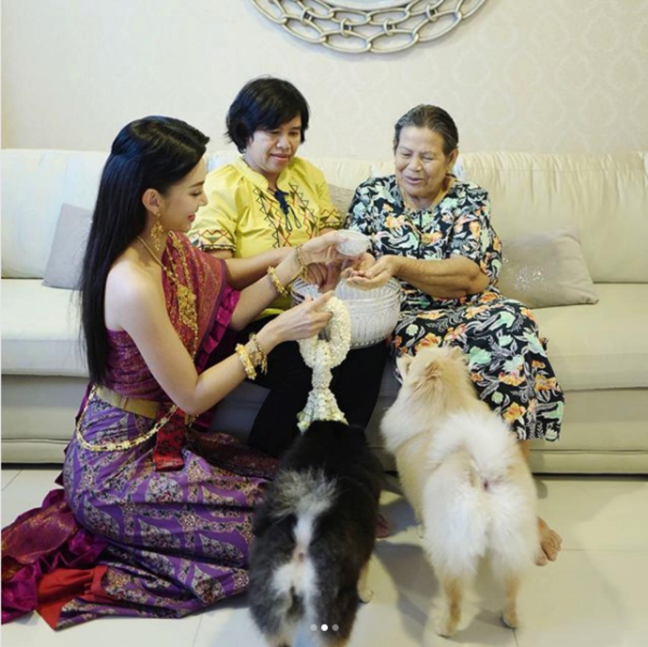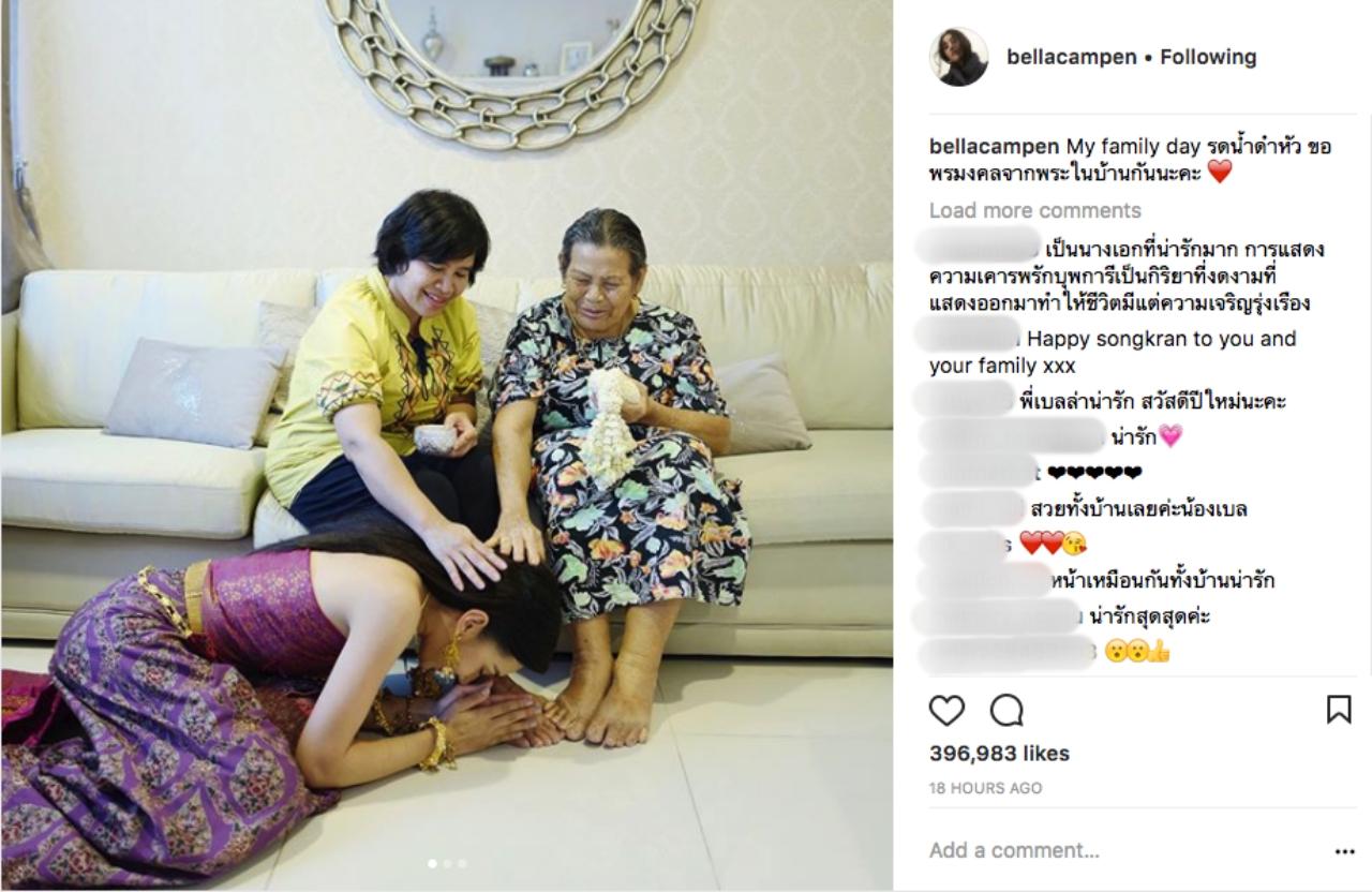 โดยเบลล่าได้โพสต์ภาพตนเองสวมชุดไทยเหมือนแม่หญิงการะเกด เข้ารดน้ำดำหัวและกราบเท้าคุณแม่ และผู้ใหญ่ภายในบ้าน เพื่อเป็นสิริมงคลชีวิต เนื่องในเทศกาลสงกรานต์ และปีใหม่ไทย พร้อมระบุข้อความว่า "My family day รดน้ำดำหัว ขอพรมงคลจากพระในบ้านกันนะคะ"