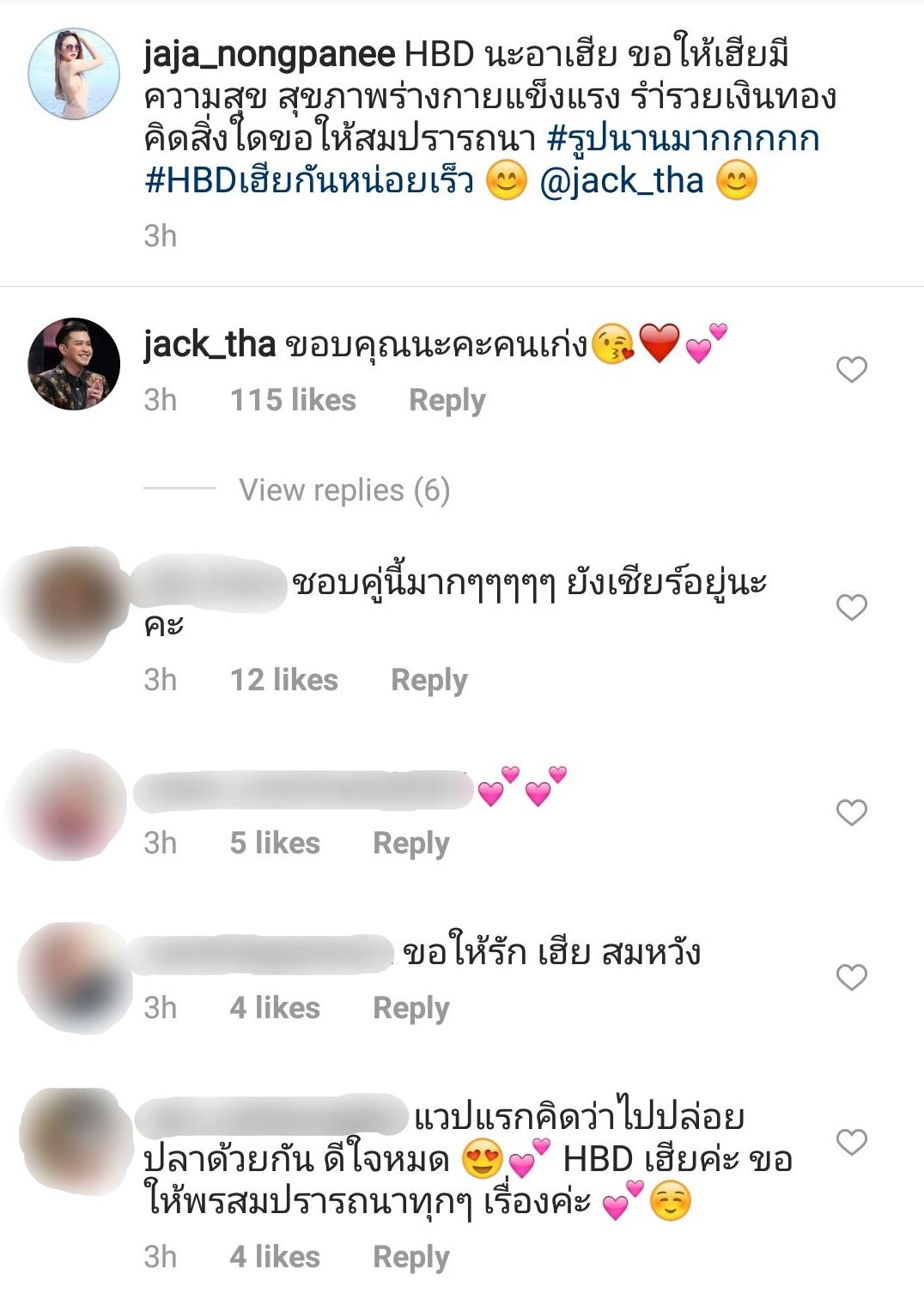 โดย จ๊ะ ได้โพสต์ภาพคู่กับ แจ๊ค เมื่อตอนที่ไปปล่อยปลาด้วยกัน พร้อมทั้งเขียนข้อความว่า “HBD นะอาเฮีย ขอให้เฮียมีความสุข สุขภาพร่างกายแข็งแรง รำ่รวยเงินทอง คิดสิ่งใดขอให้สมปรารถนา #รูปนานมากกกกก#HBDเฮียกันหน่อยเร็ว @jack_tha”