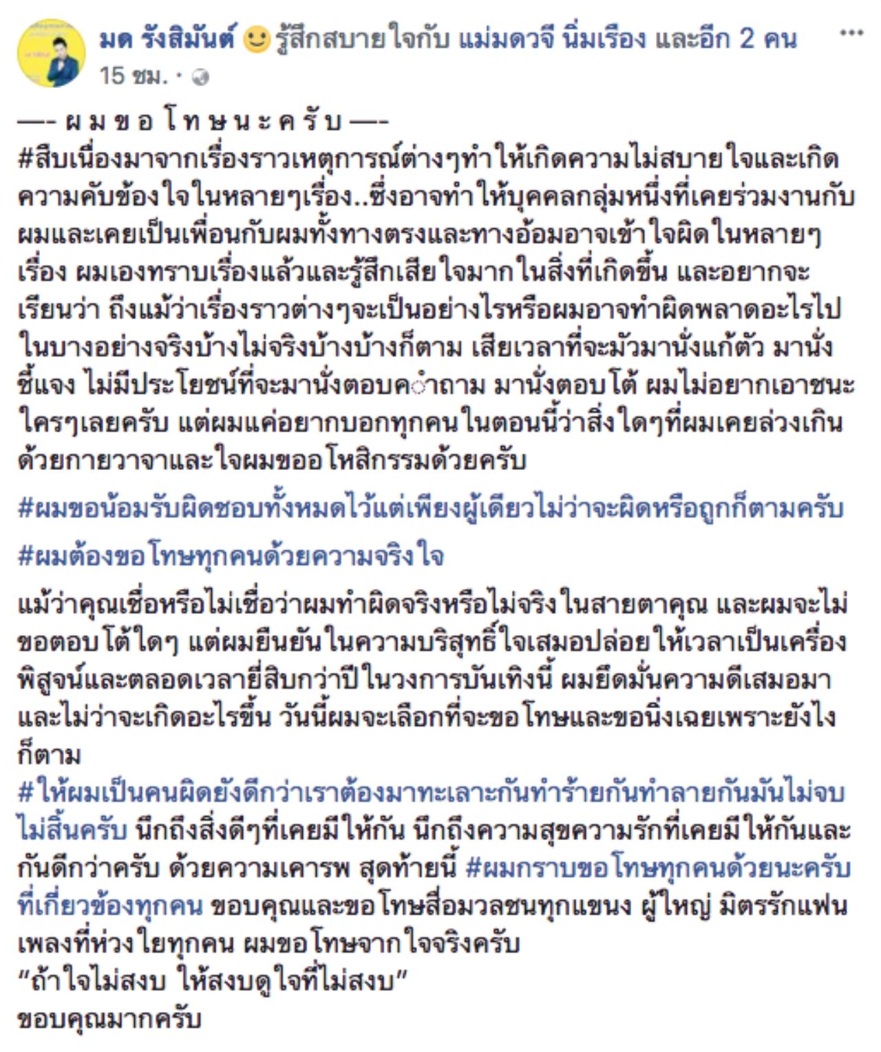 นักร้องลูกทุ่งชื่อดัง มด รังสิมันต์ โพสต์เฟซบุ๊กขอโทษบุคคลที่เคยร่วมงานด้วย รวมไปถึงเพื่อน ถ้าตนไปทำอะไรให้ไม่พอใจ โดยบอกว่า ตนเองรู้สึกเสียใจอย่างมาก เรื่องราวต่างๆ ที่เคยเกิดขึ้นอาจจะจริงบ้างและไม่จริงบ้าง ตนเองก็ขอโทษ แต่จะไม่มานั่งแก้ตัว เพราะมันไม่มีประโยชน์ใดๆ ถ้าได้ล่วงเกินไปในส่วนไหน ก็ขออโหสิกรรมให้ตนด้วย