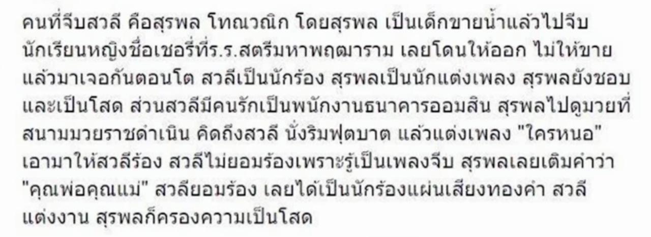 "คนที่จีบ สวลี คือสุรพล โทณะวณิก โดยสุรพล เป็นเด็กขายน้ำแล้วไปจีบนักเรียนหญิงชื่อเชอรี่ที่ ร.ร.สตรีมหาพฤฒาราม เลยโดนให้ออก ไม่ให้ขาย แล้วมาเจอกันตอนโต สวลีเป็นนักร้อง สุรพลเป็นนักแต่งเพลง สุรพลยังชอบและเป็นโสด ส่วนสวลีมีคนรักเป็นพนักงานธนาคารออมสิน