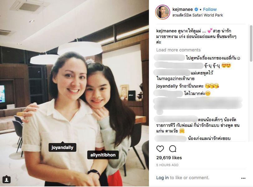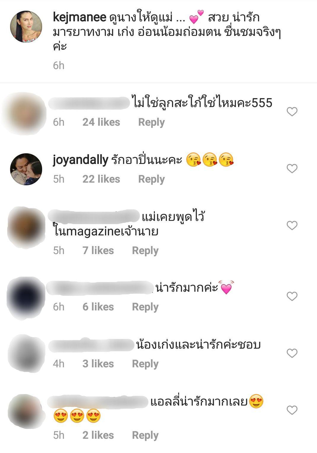 ล่าสุด จอย-น้องแอลลี่ ได้มีโอกาสเจอกับปิ่น และงานนี้ปิ่นได้โพสต์ภาพ จอย-น้องแอลลี่ พร้อมด้วยข้อความดีๆ ถึงแอลลี่และจอยว่า “ดูนางให้ดูแม่ ... สวย น่ารัก มารยาทงาม เก่ง อ่อนน้อมถ่อมตน ชื่นชมจริงๆ ค่ะ” และจอยได้เข้ามาคอมเมนต์ภาพดังกล่าวว่า “รักอาปิ่นนะคะ” นอกจากนี้ในภาพดังกล่าวมีแฟนคลับเข้ามาคอมเมนต์แซวว่า “ไม่ใช่ลูกสะใภ้ใช่ไหมคะ 555” และมีคนกดไลค์คอมเมนต์ดังกล่าวเป็นจำนวนมาก.