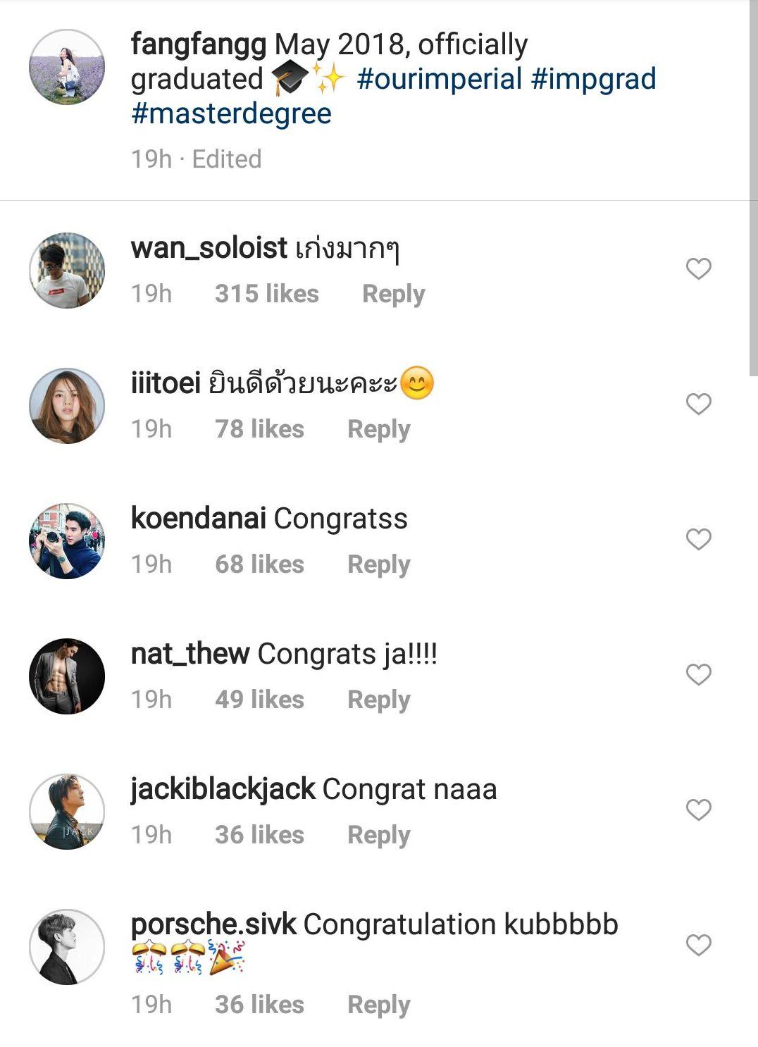 โดย ฟาง ได้โพสต์ภาพตัวเองในชุดครุยและถือหนังสือ Postgraduate Graduation 2018 ของมหาวิทยาลัย และเขียนข้อความว่า “May 2018, officially graduated #ourimperial #impgrad#masterdegree” และมีเพื่อนๆ แฟนๆ ตลอดจนคนในวงการบันเทิง อาทิ ใบเตย สุวพิชญ์, เขื่อน เคโอติก, ณัฏฐ์ ทิวไผ่งาม, แจ๊ค แบล็กแจ๊ค, ดาว พอฤทัย ณรงค์เดช, เต้ ภูริต ภิรมย์ภักดี ฯลฯ คอมเมนต์แสดงความยินดี