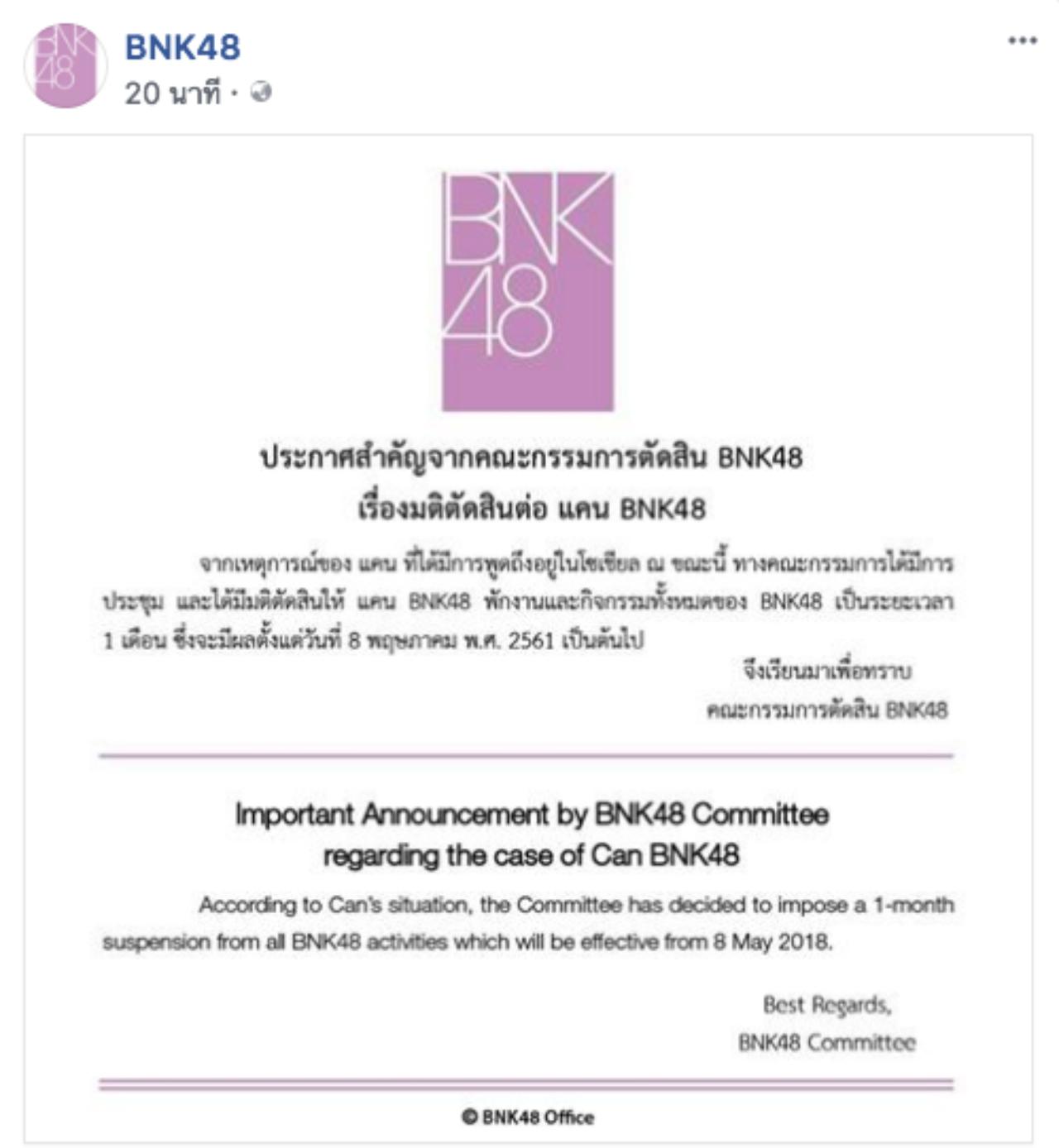 จากเหตุการณ์ของ แคน ที่ได้มีการพูดถึงอยู่ในโลกโซเชียล ณ ขณะนี้ ทางคณะกรรมการได้มีการประชุม และมีมติตัดสินให้ แคน BNK48 พักงานและกิจกรรมทั้งหมดของ BNK48 เป็นระยะเวลา 1 เดือน ซึ่งจะมีผลตั้งแต่วันที่ 8 พฤษภาคม พ.ศ.2561 เป็นต้นไป