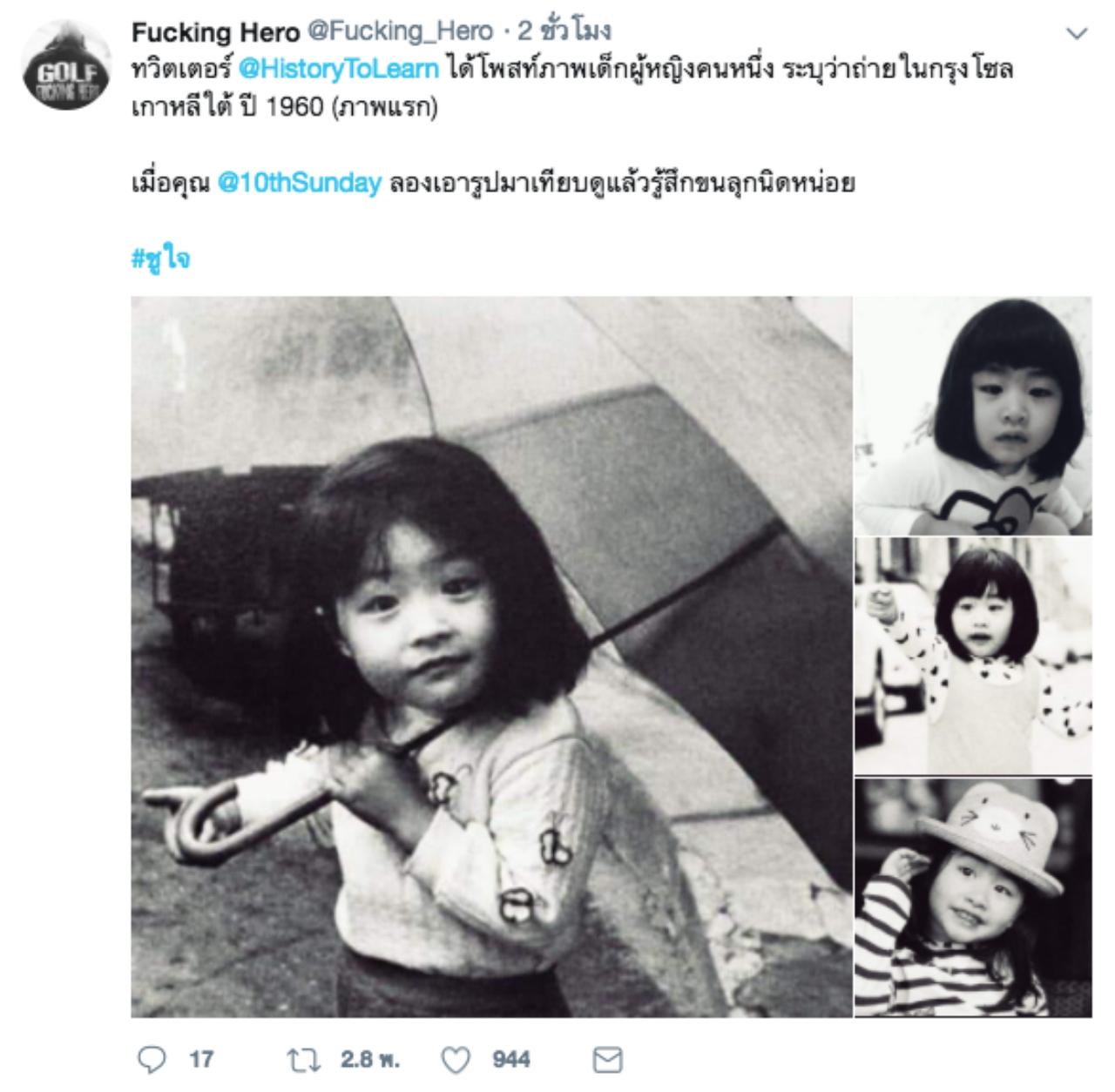 เจอแบบนี้เข้าไปถึงกับขนลุกทีเดียว สำหรับพ่อกอล์ฟ ฟักกลิ้งฮีโร่ เมื่อเจ้าตัวได้เห็นภาพๆ หนึ่งเป็นภาพขาวดำ ในภาพนั้นเป็นเด็กหญิงผมสั้นหน้าม้า หน้าละม้ายคล้ายน้องชูใจลูกสาวของตนเองอย่างมาก โดยเจ้าของทวิตเตอร์นั้นได้เขียนข้อความว่า "Seoul, South Korea. 1960s" ซึ่งภาพนี้ถ่ายที่กรุงโซล ประเทศเกาหลีใต้ ในปี 1960