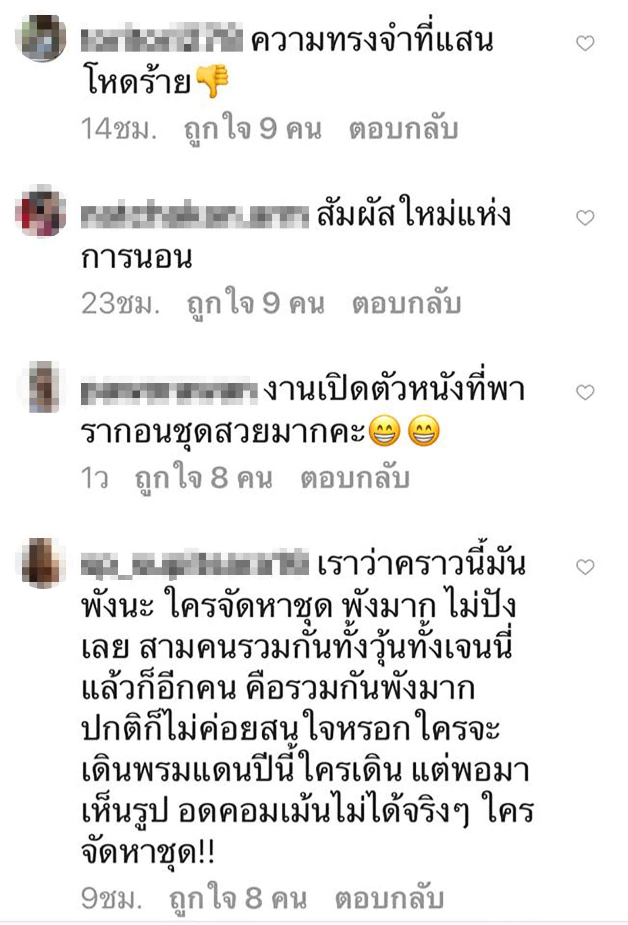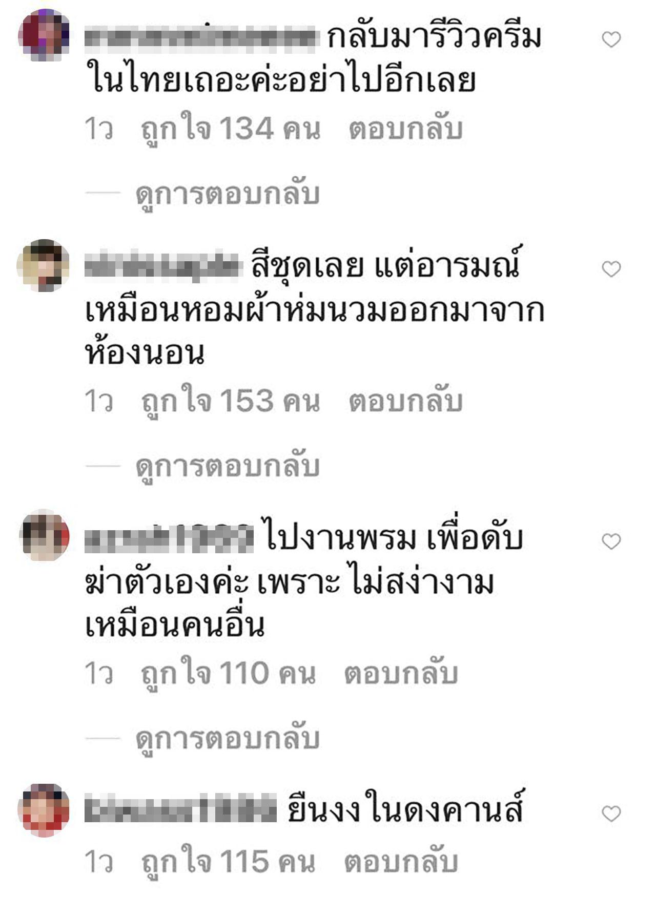 มีหลายความเห็นที่อ่านแล้วก็พยายามจะไม่ขำ ทั้งยืนงงในดงคานส์, สัมผัสใหม่แห่งการนอน, กลับมารีวิวครีมในไทยเถอะค่ะ อย่าไปอีกเลย, สีชุดเหมือนหอบผ้านวมออกจากห้องนอน, ความทรงจำที่แสนโหดร้าย ฯลฯ มองอีกมุมใช่ว่าจะมีแต่ด่านะคะ ชมๆ อวยๆ วุ้นเส้นก็ยังพอมีให้เห็นอยู่