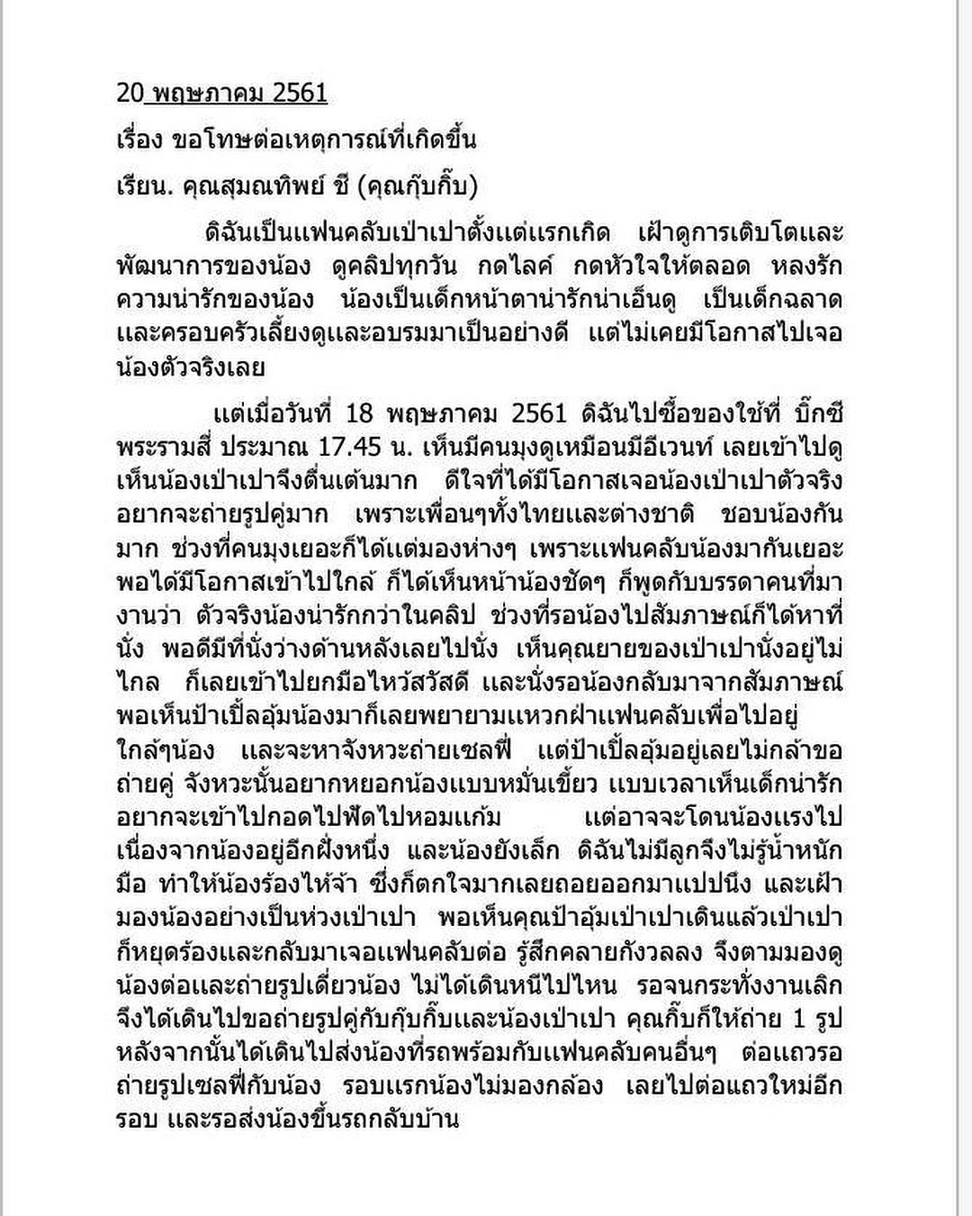 จากที่ได้อ่านจดหมายขอโทษนี้ทางครอบครัวเราคิดว่าเข้าใจเจตนาของคุณผู้หญิงคนนี้ที่ชี้แจงกับทางเราเป็นอย่างดีและพร้อมรับคำขอโทษที่ได้รับมาค่ะ เพียงแต่เจตนาที่โพสต์ชี้แจงในวันนี้คือกิ๊บอยากฝากเรื่องนี้ไว้ให้ทุกคนได้รับทราบแทนผู้ปกครองทุกท่านถึงมาตรฐานและมารยาทเบื้องต้นในการเข้าหาชื่นชมหรือเล่นหยอกล้อกับเด็กๆ เท่านั้นเอง
