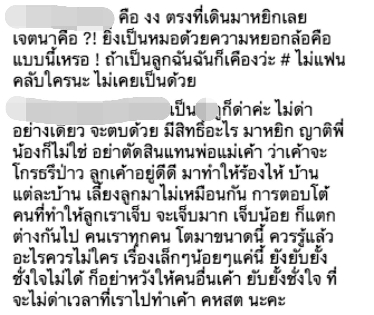 "เป็น_ก็ด่าค่ะ ไม่ด่าอย่างเดียว จะตบด้วย มีสิทธิ์อะไร มาหยิก ญาติพี่น้องก็ไม่ใช่ อย่าตัดสินแทนพ่อแม่เค้า ว่าเค้าจะโกรธรึป่าว ลูกเค้าอยู่ดีดี มาทำให้ร้องไห้ บ้านแต่ละบ้าน เลี้ยงลูกมาไม่เหมือนกัน การตอบโต้คนที่ทำให้ลูกเราเจ็บ จะเจ็บมาก เจ็บน้อย ก็แตกต่างกันไป คนเราทุกคน โตมาขนาดนี้ ควรรู้แล้วอะไรควรไม่ใคร เรื่องเล็กๆน้อยๆแค่นี้ ยังยับยั้งชั่งใจไม่ได้ ก็อย่าหวังให้คนอื่นเค้ายับยั้งชั่งใจ ที่จะไม่ด่าเวลาที่เราไปทำเค้า คหสต นะคะ"