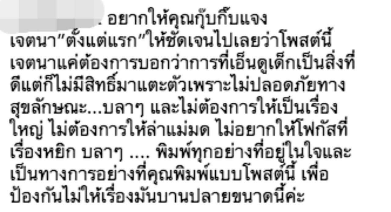 แต่ก็มีบางคนที่พูดกลางๆ ไม่อยากให้เรื่องบานปลาย "อยากให้คุณกุ๊บกิ๊บแจงเจตนา”ตั้งแต่แรก”ให้ชัดเจนไปเลยว่าโพสต์นี้เจตนาแค่ต้องการบอกว่าการที่เอ็นดูเด็กเป็นสิ่งที่ดีแต่ก็ไม่มีสิทธิ์มาแตะตัวเพราะไม่ปลอดภัยทางสุขลักษณะ...บลาๆ และไม่ต้องการให้เป็นเรื่องใหญ่ ไม่ต้องการให้ล่าแม่มด ไม่อยากให้โฟกัสที่เรื่องหยิก บลาๆ .... พิมพ์ทุกอย่างที่อยู่ในใจและเป็นทางการอย่างที่คุณพิมพ์แบบโพสต์นี้ เพื่อป้องกันไม่ให้เรื่องมันบานปลายขนาดนี้ค่ะ"