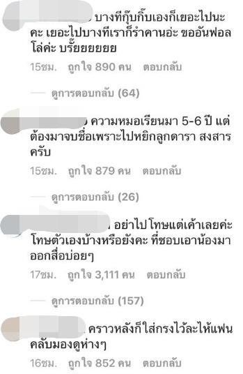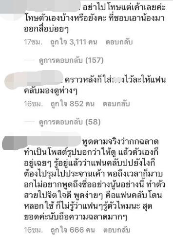 "พูดความจริงกกฉลาดทำเป็นโพสต์รูปบอกว่าให้ดูแล้วตัวเองก็อยู่เฉยๆ รู้อยู่แล้วว่าแฟนคลับยังไงก็ต้องไปรุมประจานเค้า พอถึงเวลาก็มาบอกไม่อยากพูดถึงชื่ออย่างนู้นอย่างนี้ ทำตัวสวยไปจิตใจดี พูดง่ายๆ คือแฟนคลับโดนหลอกใช้ ก็ไม่รู้ว่าแฟนๆ รู้ตัวไหมนะ สุดยอดค่ะนับถือความฉลาดมากๆ"