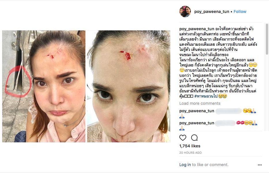 ล่าสุดก็มีเหตุที่ทำให้สาวปอยต้องเจ็บตัว เมื่อเจ้าตัวเดินไปชนตู้เสาไฟฟ้าขณะที่กำลังเดินอยู่กับลูกสาว และเจ้าตัวได้โพสต์ภาพหน้าตัวเองซึ่งตรงหน้าผากมีรูและมีเลือดออก พร้อมทั้งเขียนข้อความว่า