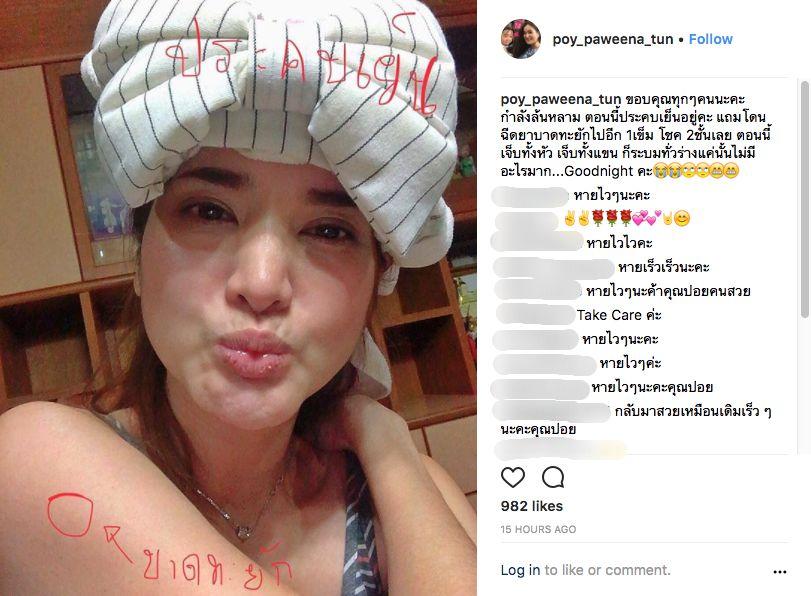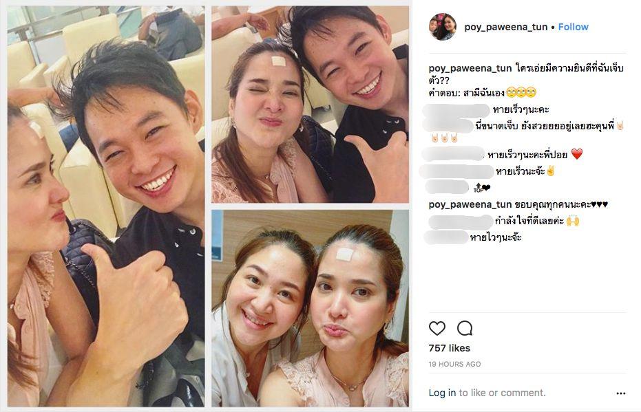 ซึ่งหลังจากที่เจ้าตัวได้โพสต์ภาพดังกล่าวก็มีเพื่อนๆ ตลอดจนแฟนคลับแสดงความห่วงใยเป็นจำนวนมาก ก่อนที่สาวปอยจะเข้ามาตอบขอบคุณทุกคอมเมนต์และโพสต์ภาพตัวเองกับสามีในเวลาต่อมาด้วยข้อความฮาๆ ว่า “ใครเอ่ยมีความยินดีที่ฉันเจ็บตัว?? คำตอบ: สามีฉันเอง”