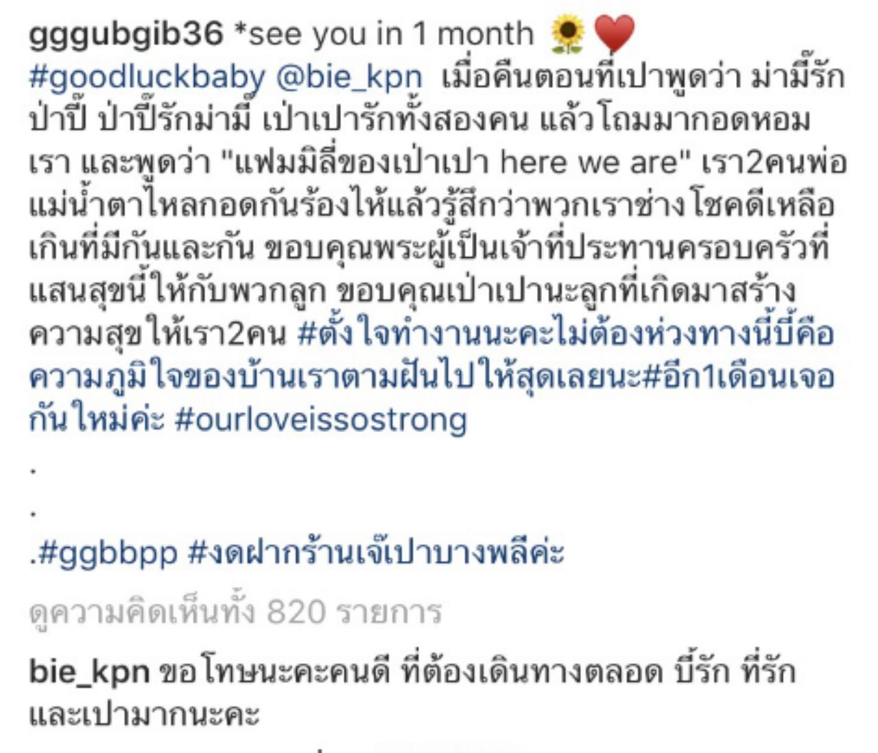 โดยมี บี้ เข้ามาคอมเมนต์ว่า "ขอโทษนะคะคนดี ที่ต้องเดินทางตลอด บี้รักที่รักและเปามากนะคะ"