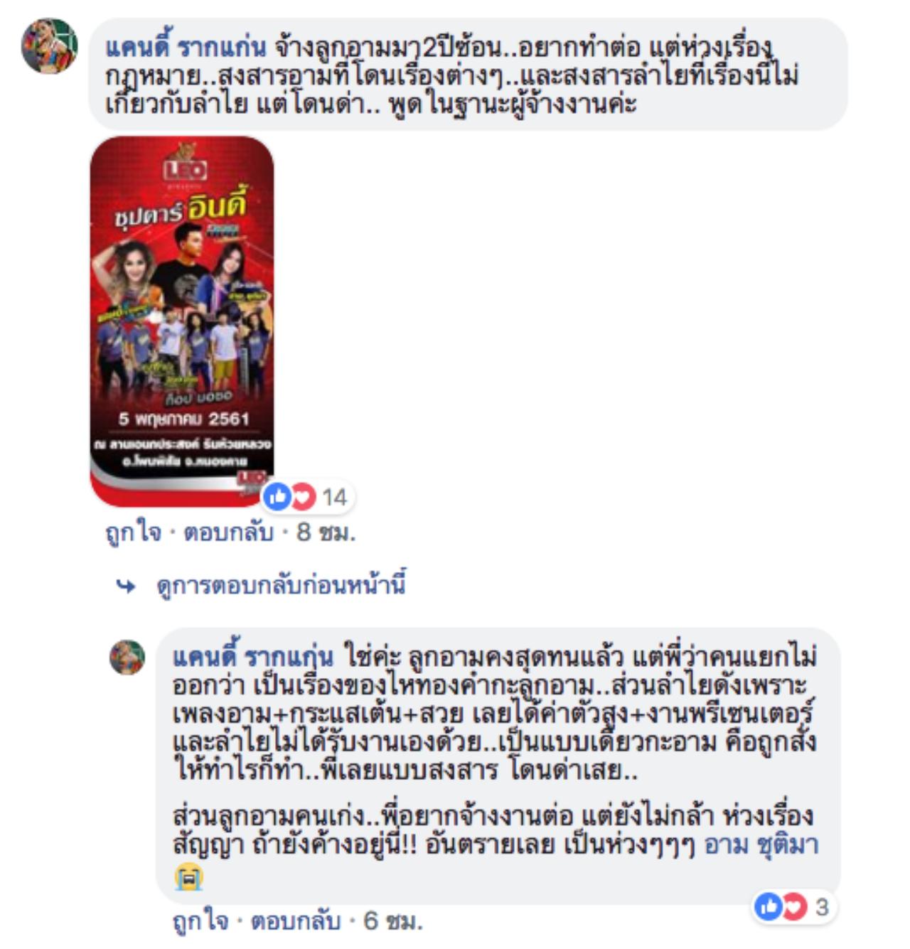 ล่าสุดนักร้องลูกทุ่งดัง แคนดี้ รากแก่น ทายาทหมอลำชื่อดัง บานเย็น รากแก่น ก็ได้ออกมาโพสต์เฟซบุ๊กแสดงความคิดเห็นเกี่ยวกับเรื่องนี้ โดยเจ้าตัวบอกว่า รู้สึกสงสาร ลำไย ไหทองคำ เป็นที่สุด และลำไยกับอามก็รักกันดี ไม่ได้มีปัญหาอะไรกันเลย