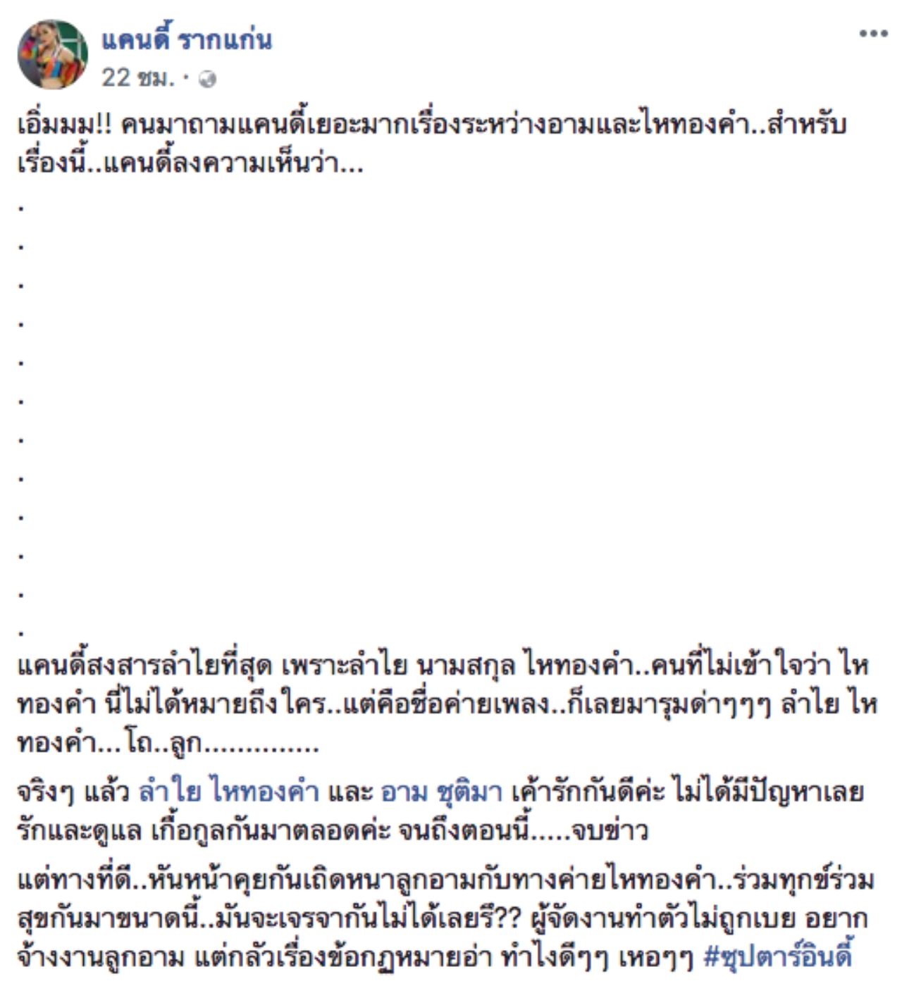 "เอิ่มมม!! คนมาถามแคนดี้เยอะมากเรื่องระหว่างอามและไหทองคำ สำหรับเรื่องนี้แคนดี้ลงความเห็นว่า แคนดี้สงสารลำไยที่สุด เพราะลำไย นามสกุล ไหทองคำ คนที่ไม่เข้าใจว่า ไหทองคำ นี่ไม่ได้หมายถึงใคร แต่คือชื่อค่ายเพลง ก็เลยมารุมด่าๆๆๆ ลำไย ไหทองคำ โถ ลูก