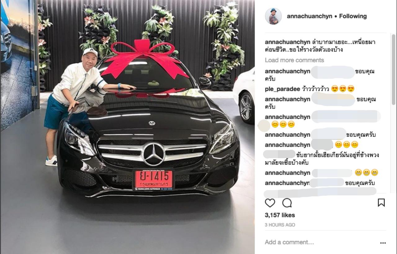 ล่าสุดหลังโด่งดังปั๊มเงินมาสักระยะ แอนนา ก็ขอให้รางวัลชีวิตกับรถเบนซ์คันใหม่ป้ายแดง พร้อมได้โพสต์อินสตาแกรมโชว์วันไปรับรถคันใหม่สุดหรู ป้ายแดง โดยมีแคปชั่นว่า “ลำบากมาเยอะ...เหนื่อยมาค่อนชีวิต..ขอให้รางวัลตัวเองบ้าง” ซึ่งก็มีแฟนคลับหลายคนต่างเข้ามาแสดงความยินดีและชื่นชมในความมานะบากบั่นกันยกใหญ่กับซุป'ตาร์ตลกคนนี้.