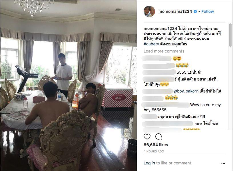 โดย คุณแม่งามทิพย์ ได้โพสต์ภาพลูกชายทั้ง 3 คน บอย, หน่อง, ภัทร โดย บอย-หน่อง ถอดเสื้อและเปิดพัดลมในห้องทานอาหารพร้อมด้วยข้อความว่า “ไม่ต้องมาตกใจหน่อง ขอประจานหน่อย เมื่อไหร่จะใส่เสื้ออยู่บ้านกัน แอร์ก็มีให้ทุกพื้นที่ ร้อนก็เปิดดิ รำครานนนนนน #cubetv ต้องขอบคุณภัทร”