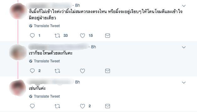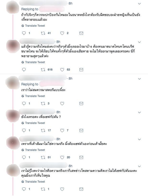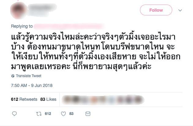 แต่ก็มีกระแสโจมตีฝ่ายหญิงมากเช่นกัน จนเจ้าตัวต้องทวีตข้อความตอบกลับไปว่า “แล้วรู้ความจริงไหมล่ะคะว่าจริงๆ ตัวมิ้งเจออะไรมาบ้าง ต้องทนมาขนาดไหน โดนบรีฟขนาดไหน จะให้เงียบให้ทน ทั้งๆ ที่ตัวมิ้งเองเสียหาย จะไม่ให้ออกมาพูดเลยเหรอคะ นี่ก็พยายามสุดๆ แล้วค่ะ”