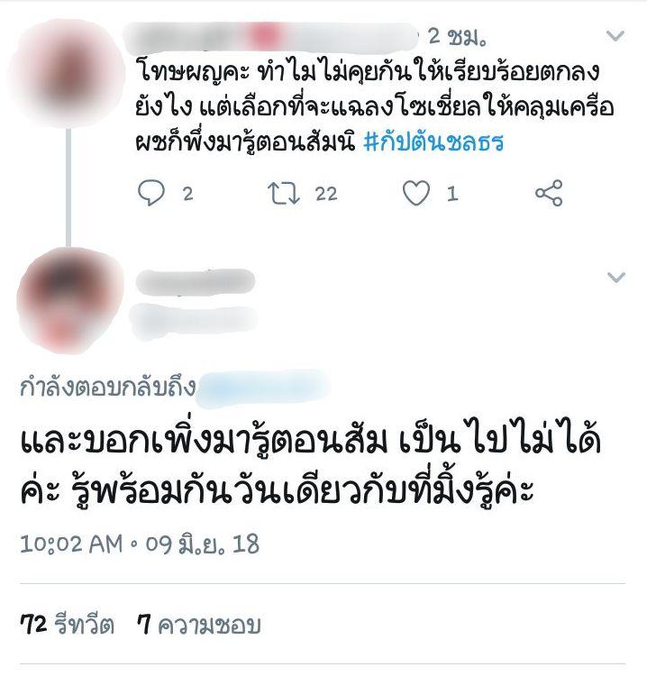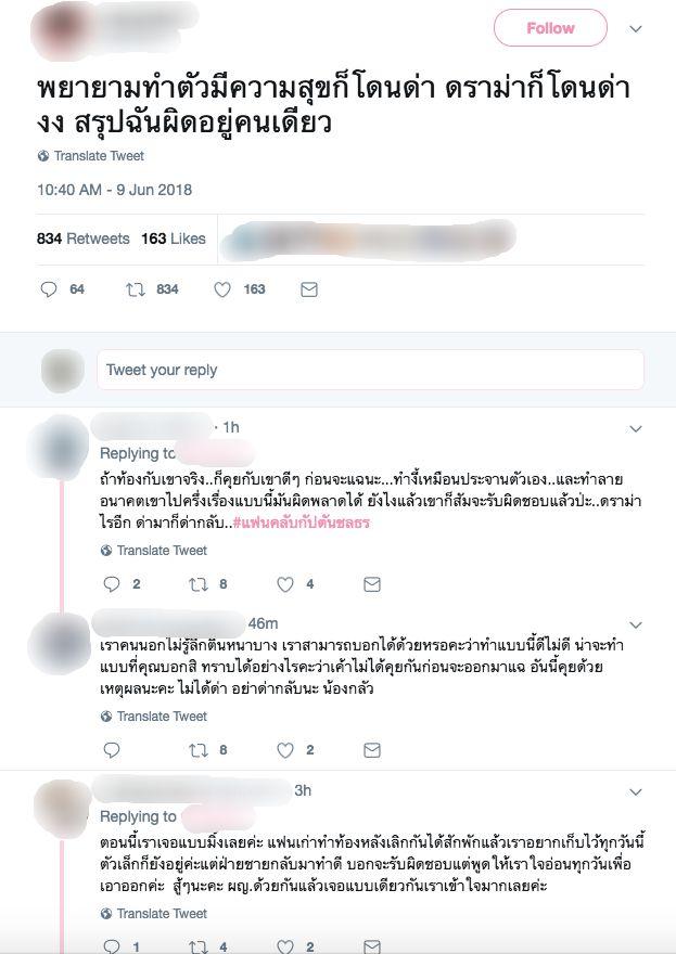 และข้อความโต้ตอบหลัง กัปตัน บอกว่าเพิ่งรู้ว่าฝ่ายหญิงท้องตอนนักข่าวสัมภาษณ์ “และบอกเพิ่งมารู้ตอนสัม เป็นไปไม่ได้ค่ะ รู้พร้อมกันวันเดียวกับที่มิ้งรู้ค่ะ” และมีการโต้ตอบกันไปมากับชาวทวิตเตอร์ด้วย