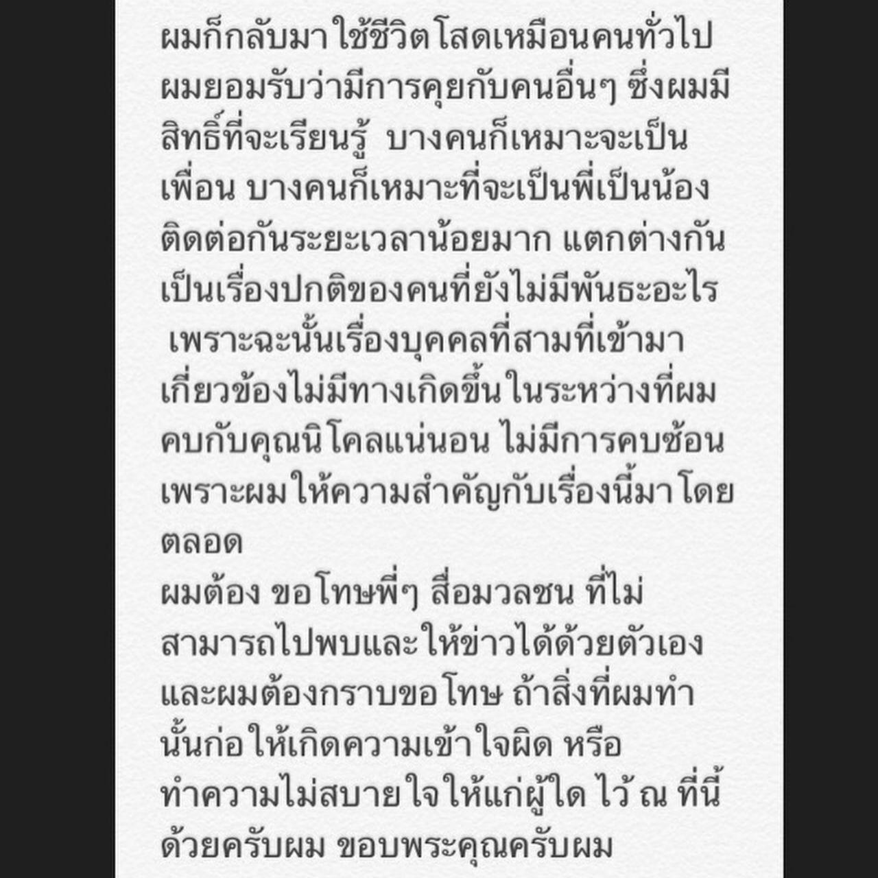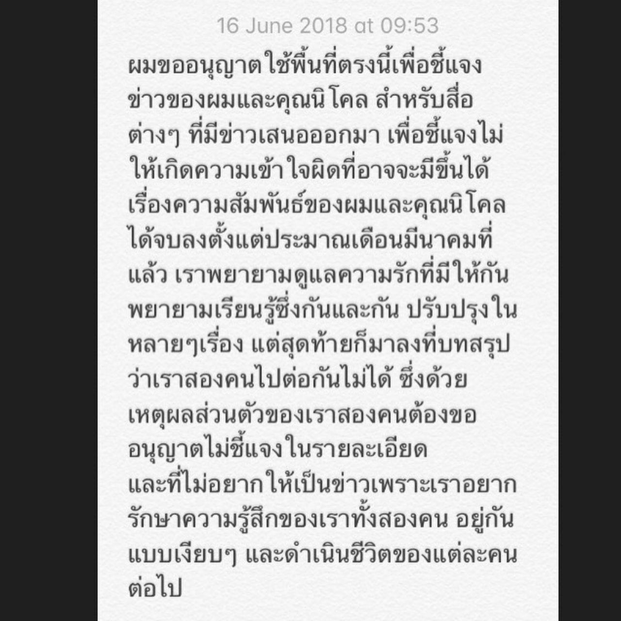 "ผมขออนุญาตใช้พื้นที่ตรงนี้เพื่อชี้แจงข่าวของผมและคุณนิโคล สำหรับสื่อต่างๆ ที่มีข่าวเสนอออกมาเพื่อชี้แจงไม่ให้เกิดความเข้าใจผิดที่อาจจะมีขึ้นได้ เรื่องความสัมพันธ์ของผมและคุณนิโคลได้จบลงตั้งแต่ประมาณเดือนมีนาคมที่แล้ว เราพยายามดูแลความรักที่มีให้กันพยายามเรียนรู้ซึ่งกันและกัน ปรับปรุงในหลายๆ เรื่อง