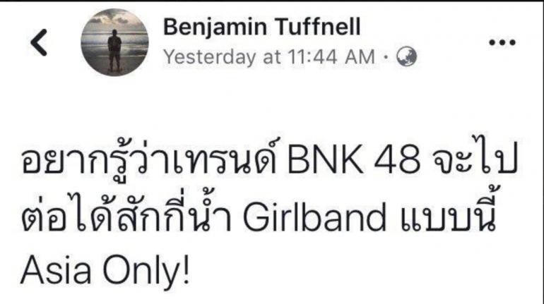 กลายเป็นดราม่าไปแล้วเมื่ออดีตนักร้องหนุ่ม เบน เบนจามิน ทัฟเนล หรือ เบน ซิลลี่ฟูลส์ (Silly Fools) ได้โพสต์ข้อความวิพากษ์วิจารณ์วงไอดอลสาว BNK48 ในเฟซบุ๊กว่า “อยากรู้ว่าเทรนด์ BNK 48 จะไปต่อได้สักกี่น้ำ Girlband แบบนี้ Asia Only!”