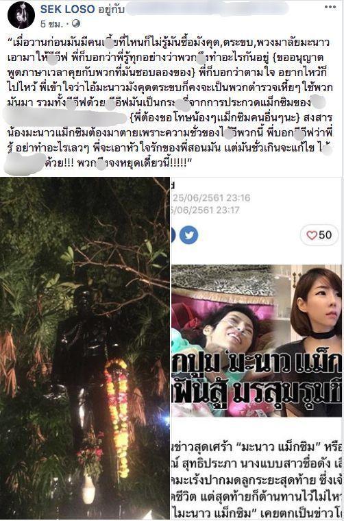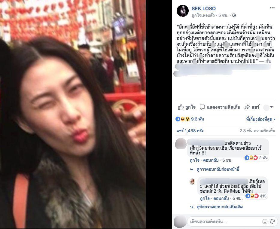 โดย เสก ได้โพสต์ภาพ อีฟ ในแฟนเพจ SEK LOSO พร้อมด้วยข้อความหยาบคายว่า “อีกะ...อีฟนี่ชั่วช้าสามหาว ไม่รู้จักที่ต่ำที่สูง มันเห็นทุกอย่างเเต่อยากลองของ มันมีคนจ้างมัน เหมือนอย่างที่มันขายตัวนั่นแหละ แม่มันก็สารเลว ...บอกว่าจะเกิดเรื่องร้ายกับ-ึง, แม่-ึงและคนที่ใช้-ึงมา ...ก็ไม่เชื่อกู ไอ้พวกผู้ใหญ่ที่ใช้เด็กมา พวก-ึงสงสารมันบ้างไหม๊!?! ...ทำลายความรักบริสุทธิ์ของ_ที่ให้มัน และพวก-ึงก็ทำลายชีวิตมัน บาปหนัก!!!!!”