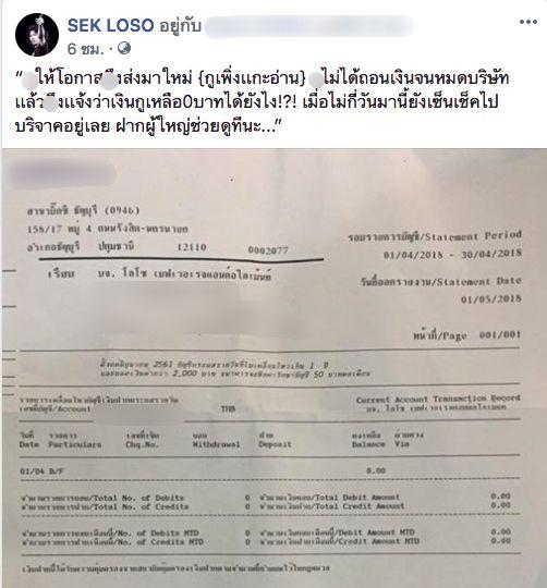 นอกจากนี้ เสกยังได้โพสต์ภาพจดหมายแจ้งความเคลื่อนไหวของบัญชีเงินฝากในธนาคารว่า “_ให้โอกาสมึงส่งมาใหม่ {_เพิ่งแกะอ่าน} _ไม่ได้ถอนเงินจนหมดบริษัท แล้วมึงแจ้งว่าเงิน_เหลือ 0 บาทได้ยังไง!?! เมื่อไม่กี่วันมานี้ยังเซ็นเช็คไปบริจาคอยู่เลย ฝากผู้ใหญ่ช่วยดูทีนะ...” งานนี้บรรดาชาวเน็ตก็ได้เข้ามาโพสต์คอมเมนต์วิจารณ์ถึงพฤติกรรมของนักร้องหนุ่มเป็นจำนวนมากว่าไม่ควรทำแบบนี้ด้วย.