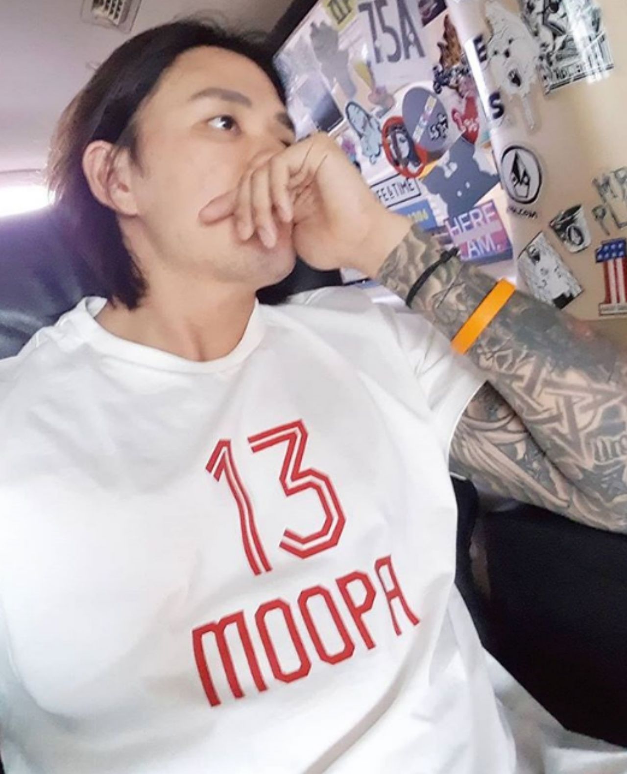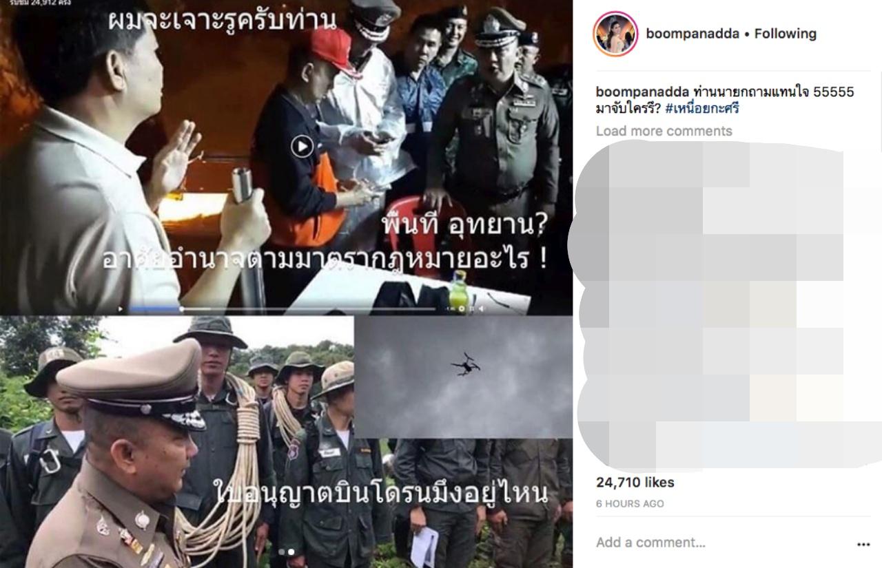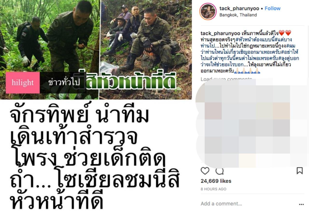 อีกรูป โพสต์ภาพตัวเองใส่เสื้อทีมหมูป่า พร้อมแคปชั่น "พวกเราทุกคน อยากเห็นน้องๆออกมา#แต่ก็อยากให้บางคนไปติดแทน#คุณก็รู้ว่าใคร..."