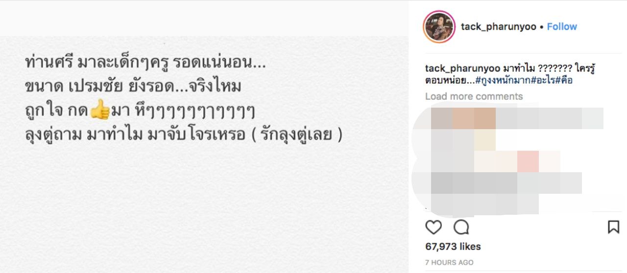 ขณะที่ แทค ภรัณยู โพสต์รัวๆ รูปแรกภาพ ภาพข่าว พล.ต.อ.จักรทิพย์ ชัยจินดา ผู้บัญชาการตำรวจแห่งชาติ พร้อมแคปชั่น "เห็นภาพนี้แล้วดีใจ ท่านสุดยอดจริงๆ#หัวหน้าต้องแบบนี้#แต่บางท่านไป...ไปทำไมไปใช่กฎหมายเหรอนี้กูงง