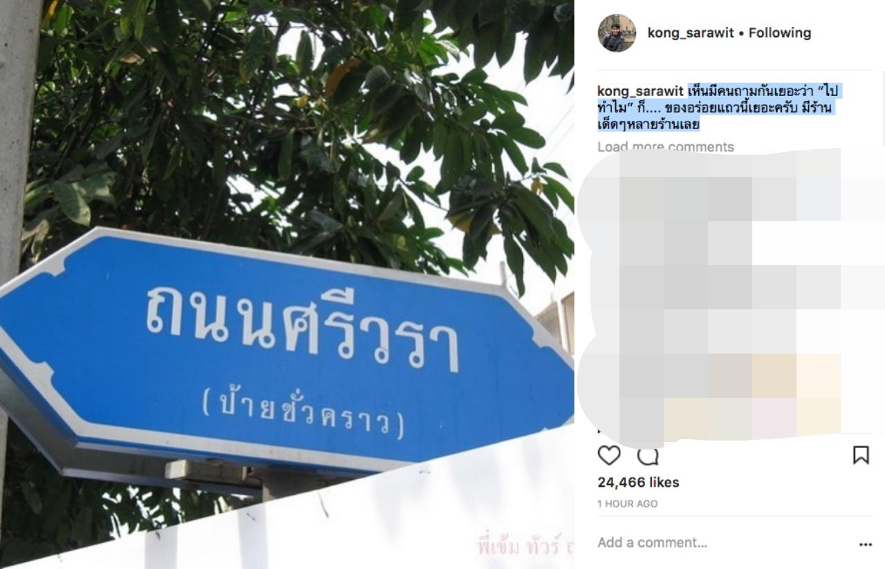 หมอก้อง สรวิชญ์ โพสต์อ้อมๆ แต่ส่อความหยอก กับภาพป้ายถนนศรีวรา และ แคปชั่น "เห็นมีคนถามกันเยอะว่า “ไปทำไม” ก็.... ของอร่อยแถวนี้เยอะครับ มีร้านเด็ดๆหลายร้านเลย"