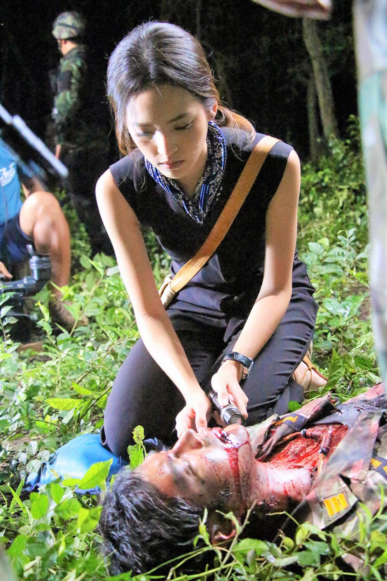 ฉากนี้ถ่ายทำกันข้ามคืน เล่นฝังเอฟเฟกต์กระสุน และระเบิด ให้นักแสดงเปิดศึกรัวกระสุนยิงกันสนั่นป่า เพื่อความสมจริง พอมาถึงฉากที่ท็อปจะต้องโดนระเบิดจากฝั่งคนร้าย บอสใหญ่อย่าง แม่หนู–สรวงสุดา ชลลัมพี ก็ลงมาลุยงานด้วยตัวเองเต็มที่ ทั้งช่วยดูรอยแผลระเบิด และตัดแต่งเสื้อผ้าที่ท็อปใส่ ฉีกขาดเสมือนจริง ส่วนนางเอกอย่าง ณิชา ก็ทำอารมณ์เรียกน้ำตากับซีนดราม่าที่เห็นท็อปโดนแรงระเบิดเลือดท่วมตัวหายใจรวยริน