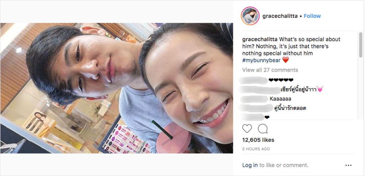 แต่หลังจากนั้นเกรซก็ได้ลบภาพข้อความดังกล่าวไปแล้ว และโพสต์ภาพคู่กับพอร์ชพร้อมด้วยข้อความว่า "What’s so special about him? Nothing, it’s just that there’s nothing special without him #mybunnybear" (มีอะไรพิเศษเกี่ยวกับเขารึเปล่า ไม่มีอะไร แค่ไม่มีอะไรพิเศษเลยถ้าไม่มีเขา)