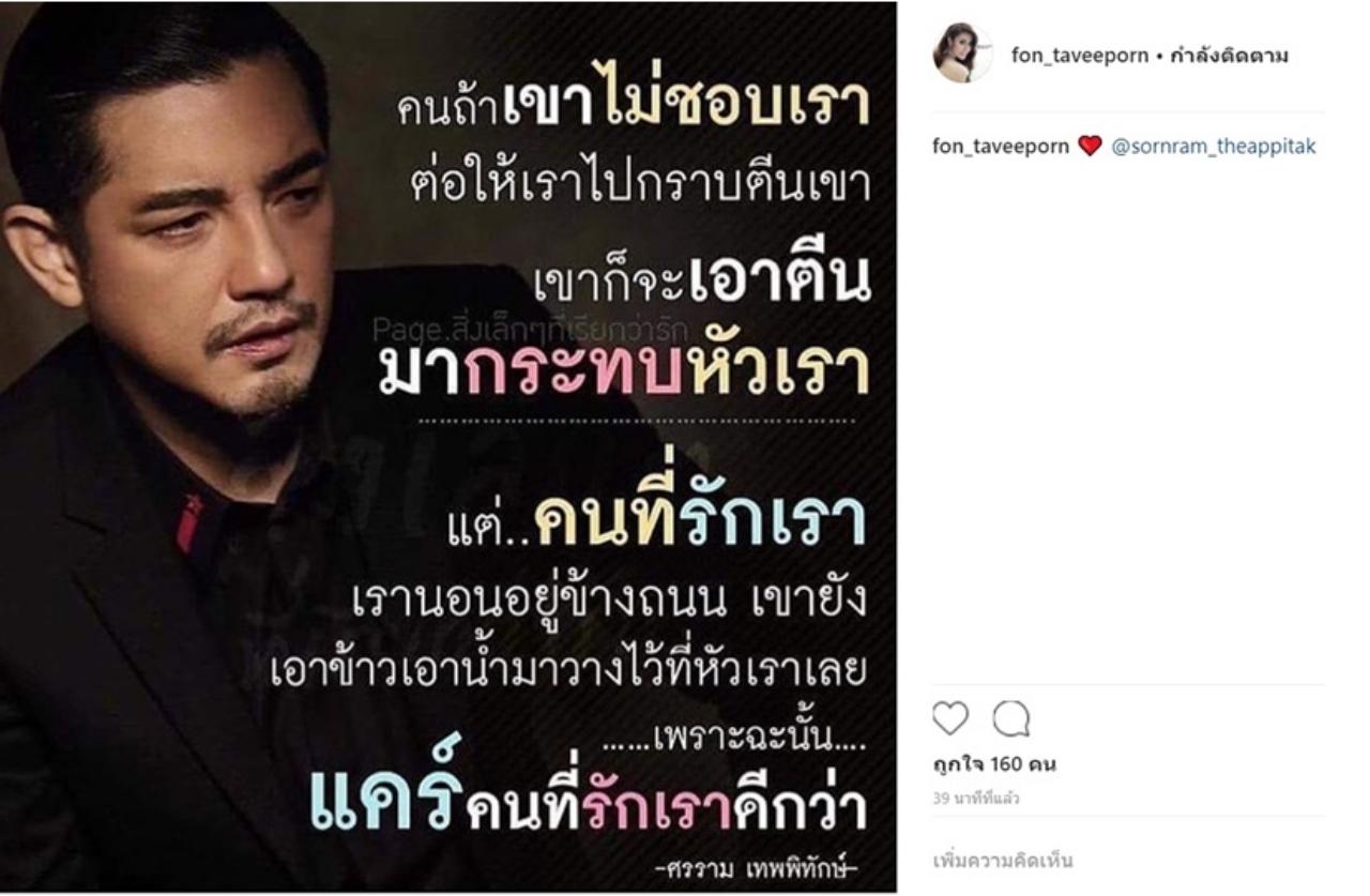 โดยล่าสุด น้ำฝน ได้โพสต์ภาพของ หนุ่ม ศรราม ที่มีข้อความว่า "คนถ้าเขาไม่ชอบเราต่อให้เราไปกราบตีนเขา เขาก็จะเอาตีนมากระทบหัวเรา แต่คนที่รักเรา เรานอนอยู่ข้างถนน เขายังเอาข้าวเอาน้ำมาวางไว้ที่หัวเราเลย เพราะฉะนั้น แคร์คนที่รักดีกว่า" และยังมีแคปชั่นรูปหัวใจ พร้อมกับติดแท็กถึง ศรราม อีกด้วย