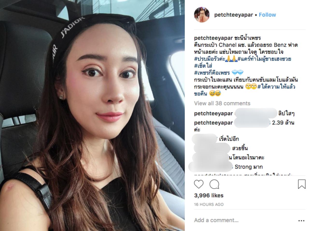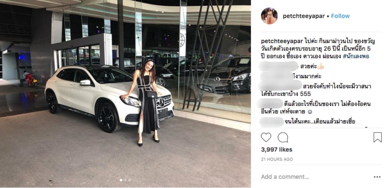 แต่งานนี้นอกจากจะซื้อรถเพื่อเป็นของขวัญวันเกิดแล้ว ยังเป็นการบอกให้ชายคนสนิทรู้ว่าเธอสวยและสตรองมาก เนื่องจากเธอเพิ่งจะถูกฝ่ายชายทวงกระเป๋าแบรนด์เนมที่เคยให้คืน แถมงานนี้เจ้าตัวยังได้ติดแฮชแท็กเพื่อให้หนุ่มคนนั้นรู้ว่า #แคร์ทำไมผู้ชายเฮงซวย #เชิ่ดใส่ #เพชรก็คือเพชร
