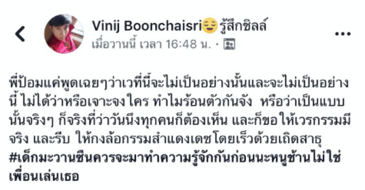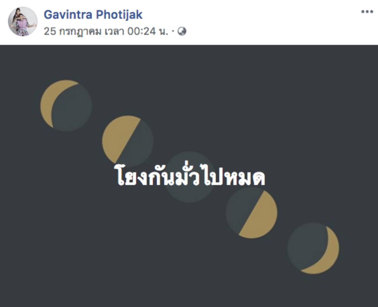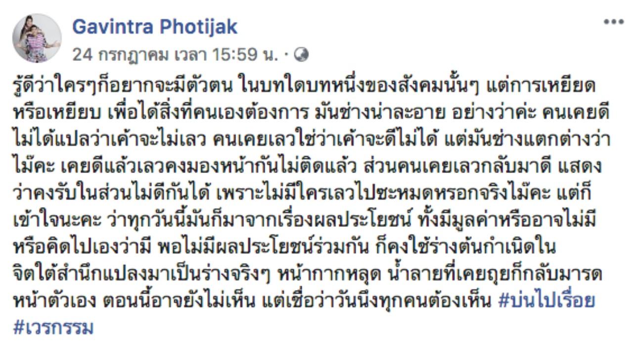 แต่จากนั้น แก้ม กวินตรา โพธิจักร ได้ออกโพสต์ในเฟซบุ๊กส่วนตัวว่า "รู้ดีว่าใครๆ ก็อยากจะมีตัวตน ในบทใดบทหนึ่งของสังคมนั้นๆ แต่การเหยียดหรือเหยียบ เพื่อได้สิ่งที่คนเองต้องการ มันช่างน่าละอาย อย่างว่าค่ะ คนเคยดีไม่ได้แปลว่าเค้าจะไม่เลว คนเคยเลวใช่ว่าเค้าจะดีไม่ได้