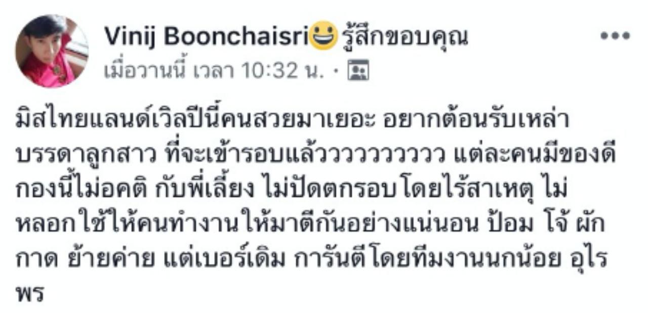ซึ่งช่างแต่งหน้าเบอร์ต้นของเมืองไทย ป้อม วินิจ บุญชัยศรี ได้ออกมาโพสต์ในกลุ่มนางงามชื่อดังว่า "มิสไทยแลนด์เวิลด์ปีนี้คนสวยมาเยอะ อยากต้อนรับเหล่าบรรดาลูกสาว ที่จะเข้ารอบแล้วววววววววว แต่ละคนมีของดี
