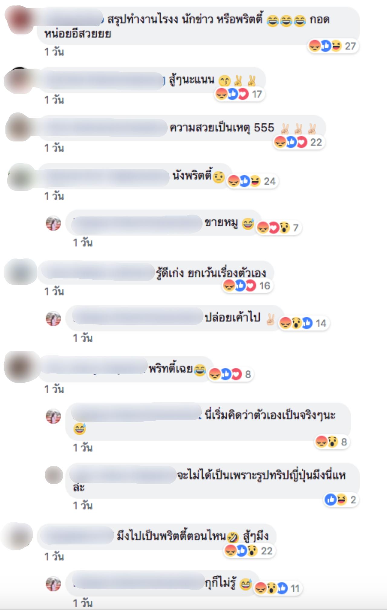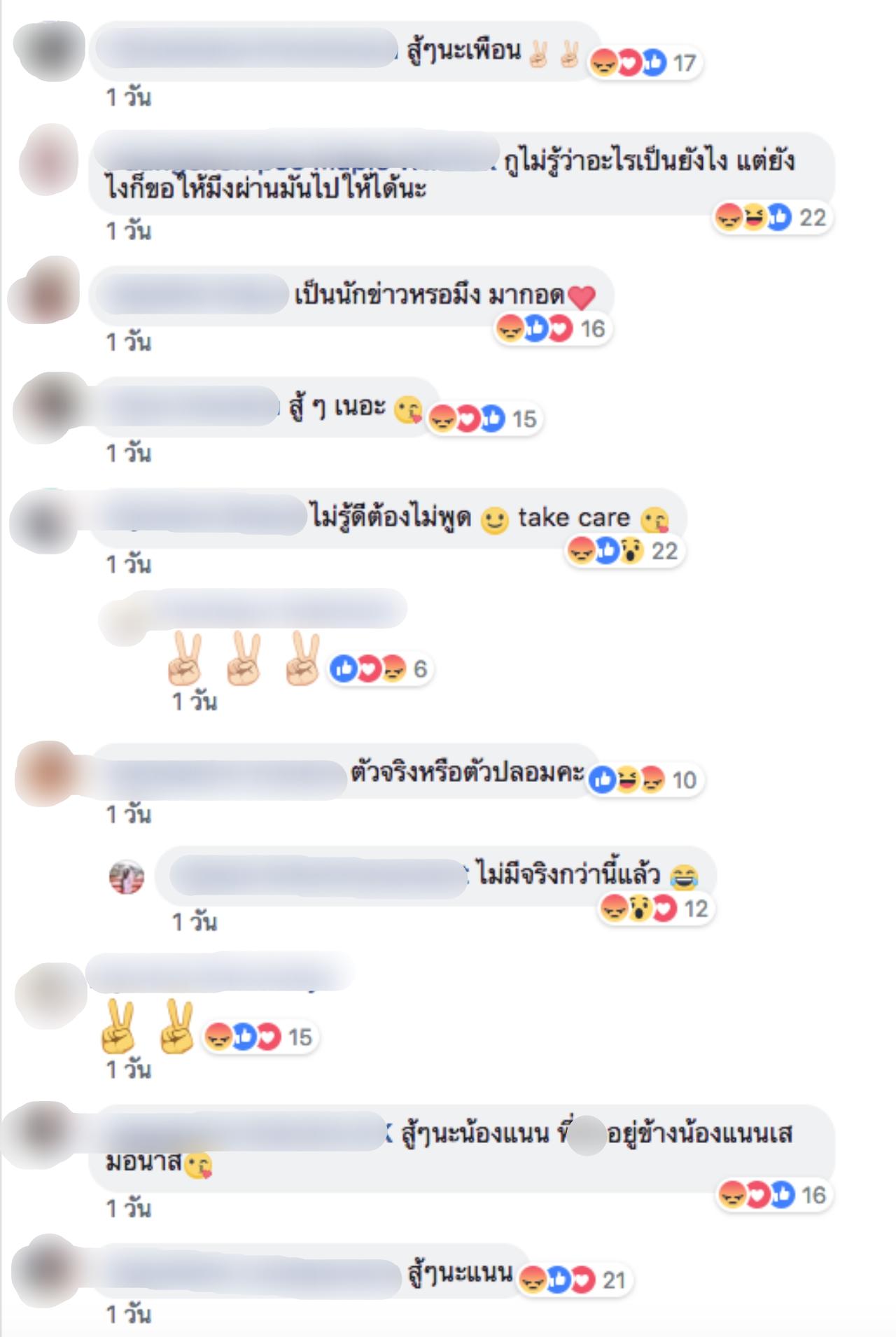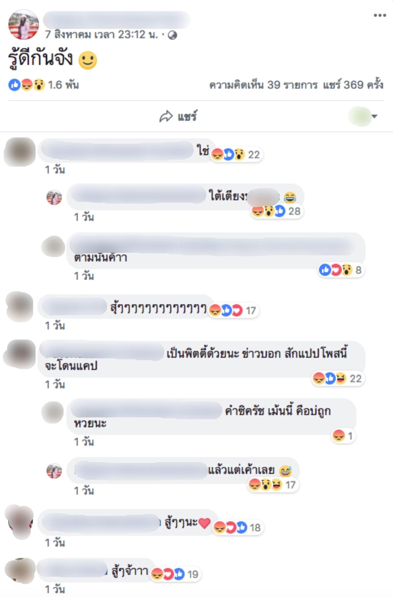ซึ่งเจ้าตัวก็ไม่ได้เปิดให้คอมเมนต์แต่อย่างใด มีแต่เพื่อนเท่านั้นที่คอมเมนต์ได้ ซึ่งสาวคนดังกล่าว ก็เข้าไปคอมเมนต์เพิ่มเติมว่า "ใต้เตียง....." และจากนั้นก็มีเพื่อนเข้ามาให้กำลังใจกันเป็นจำนวนมาก...